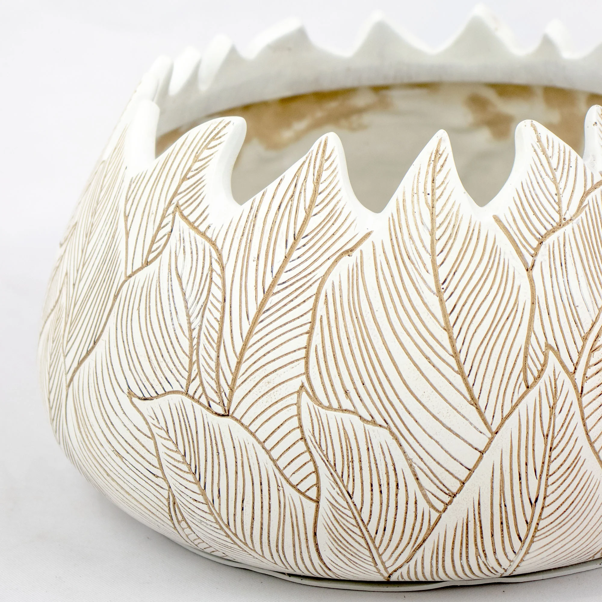 The entire surface is covered in a richly detailed carved pattern of overlapping leaves, each etched with fine lines to create a wonderfully tactile experience. The pot's unique, crown-like rim adds a touch of dramatic flair, setting it apart from ordinary planters. Finished in a soft, antique off-white, a subtle antique wash highlights every carved detail, giving it an artisanal, handcrafted feel. The neutral colour palette also makes it perfect for Coastal and Modern Rustic decor schemes.