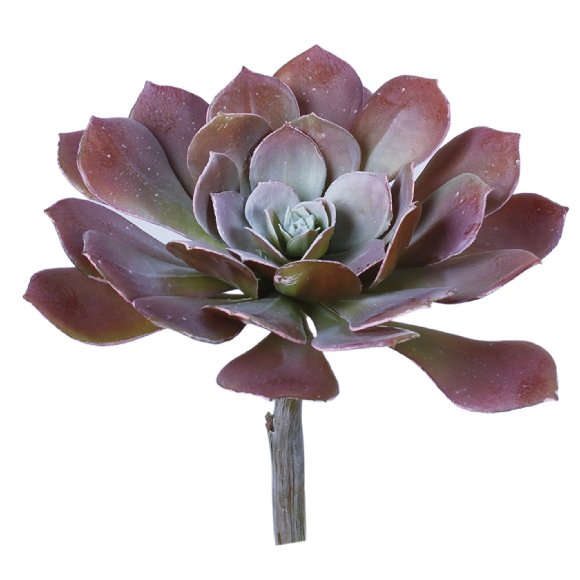 The pick measures approximately 20cm in both height and width, creating a substantial, full-bodied rosette. It features spoon-shaped leaves with pointed tips that transition from a deep, dusty purple on the outer edges to a soft light green and blue at the centre, mimicking fresh new growth. The foliage is detailed with subtle white spots that add texture and realism to the smooth, fleshy surface.