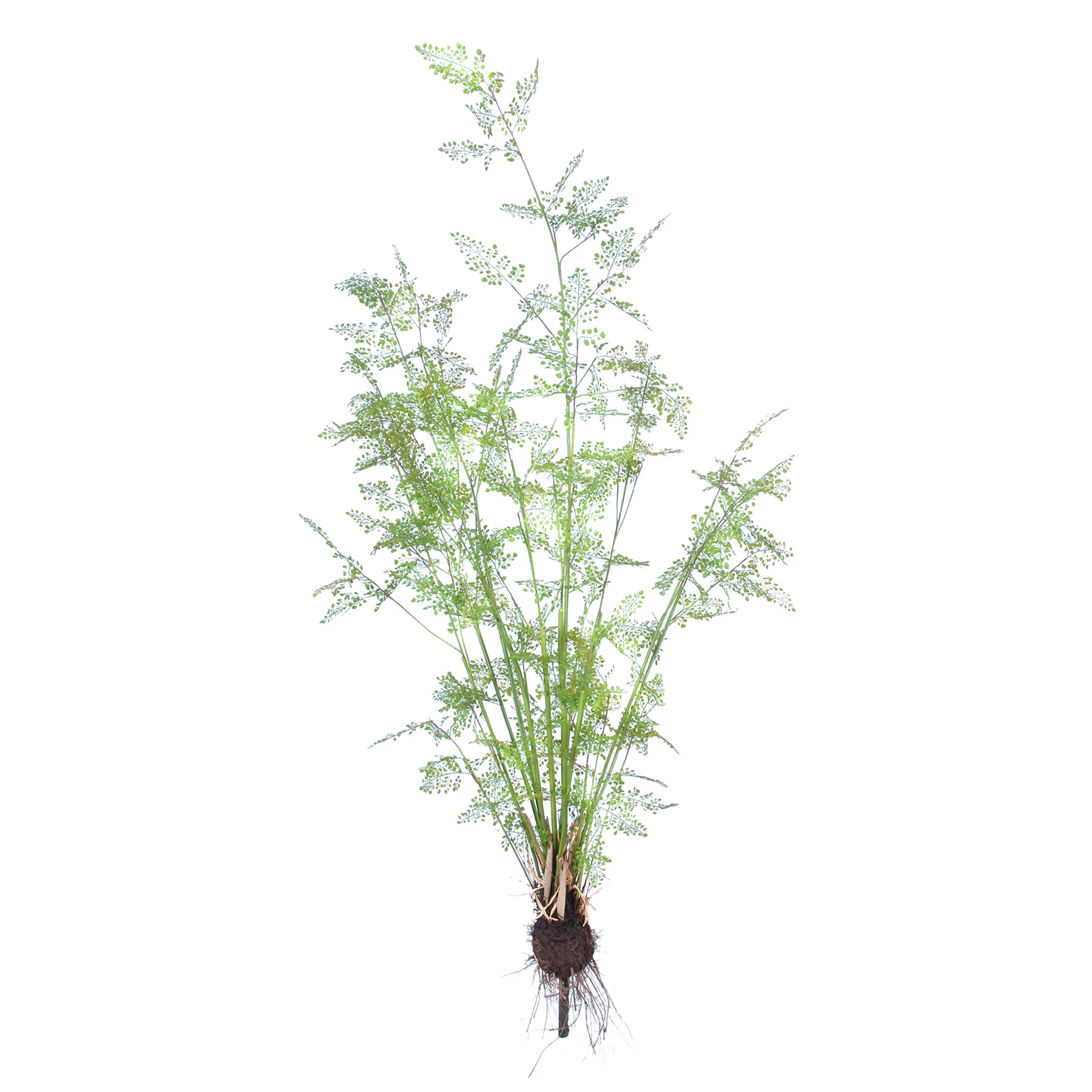 The pick measures 215cm in height and features multiple slender stems branching out from a central base. The foliage consists of light, intricate leaves that mimic the soft texture of a maidenhair fern. A key feature of this design is the realistic soil clump at the base, complete with tiny roots, which adds authenticity when "planted" into your favourite pot or container.