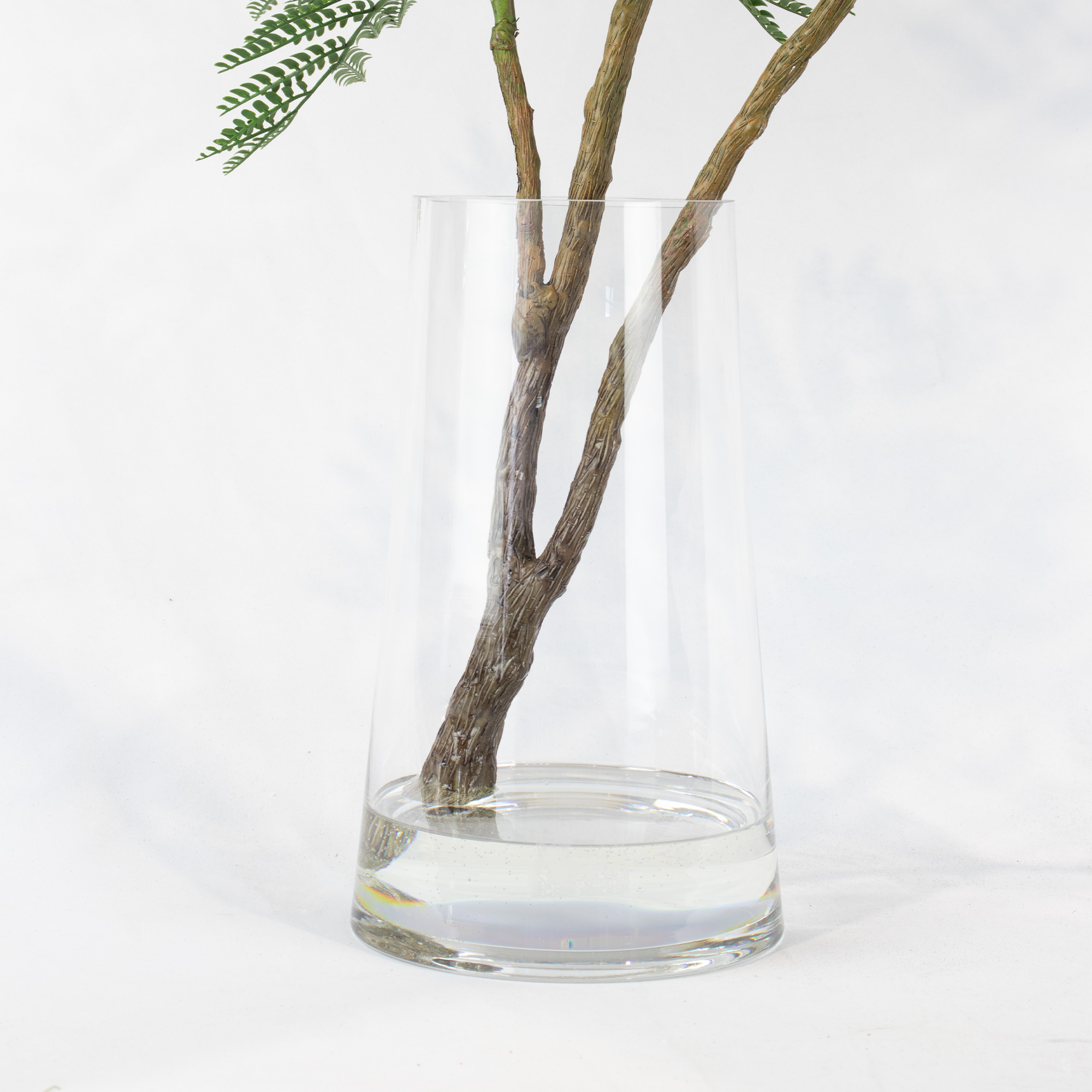 This beautiful sculptural arrangement stands at an impressive 130cm tall. It features a realistic fern-style branch, with textured stems and delicate, feathery green leaves. The branches are artfully placed in a sleek, tapered glass vase. They are permanently secured in a clear, water-like resin, giving the appearance of fresh-cut stems just added to water.