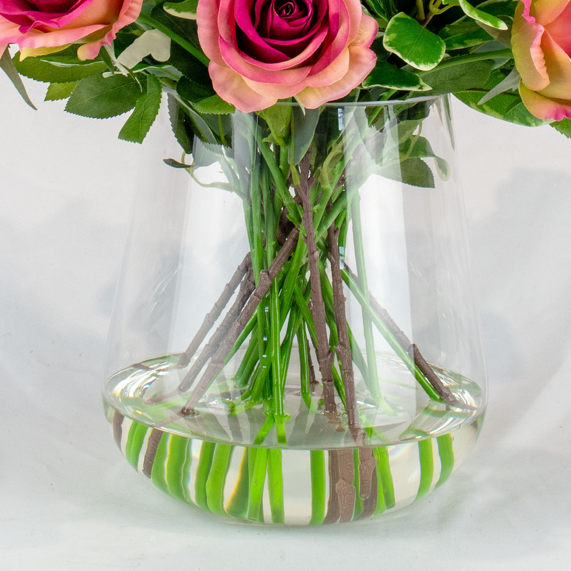 FUCHSIA ROSES WITH FOLIAGE IN TULIP VASE