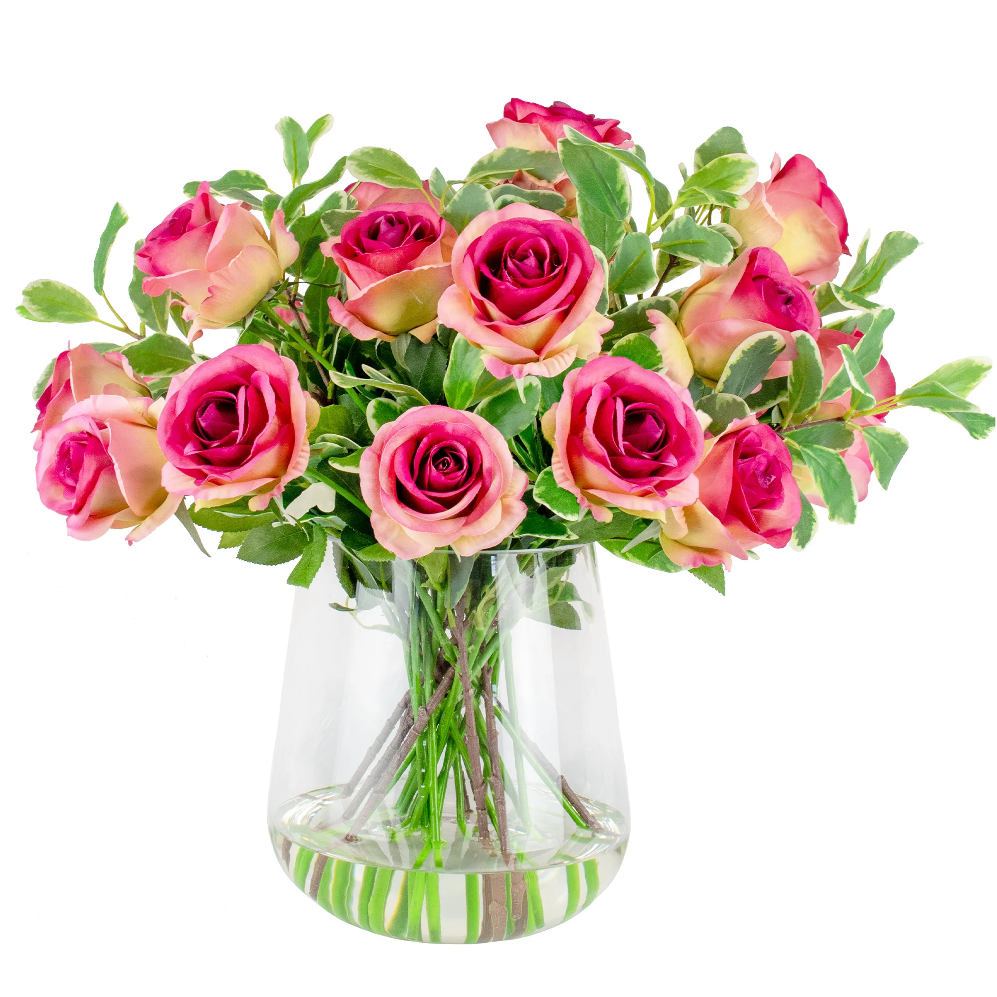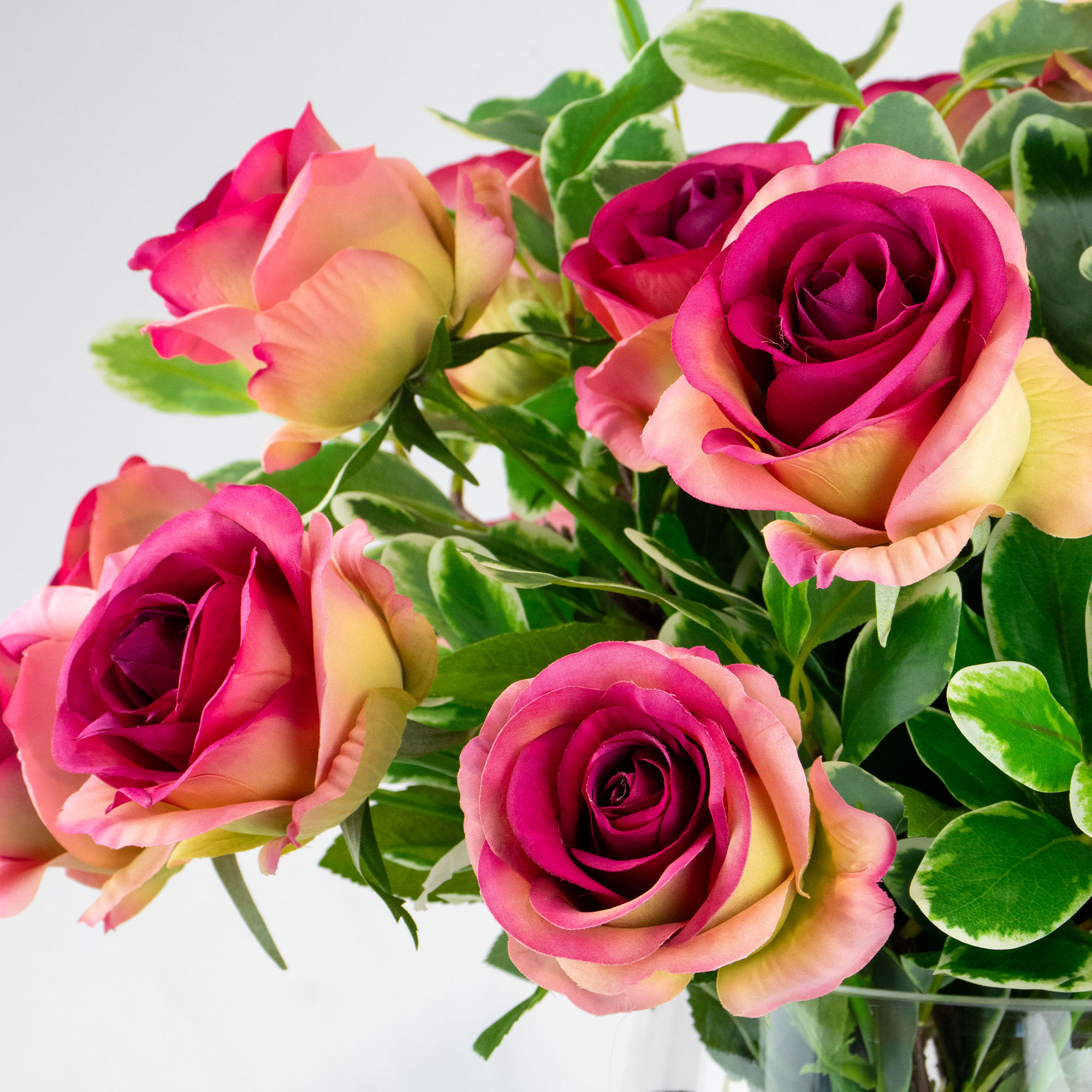 This large arrangement features a generous bunch of stunning fuchsia roses. Its main benefit is bringing a bold, romantic pop of colour to your home that lasts forever. The vibrant, two-tone pink roses offer a reliable and sophisticated look without the need for water or maintenance.