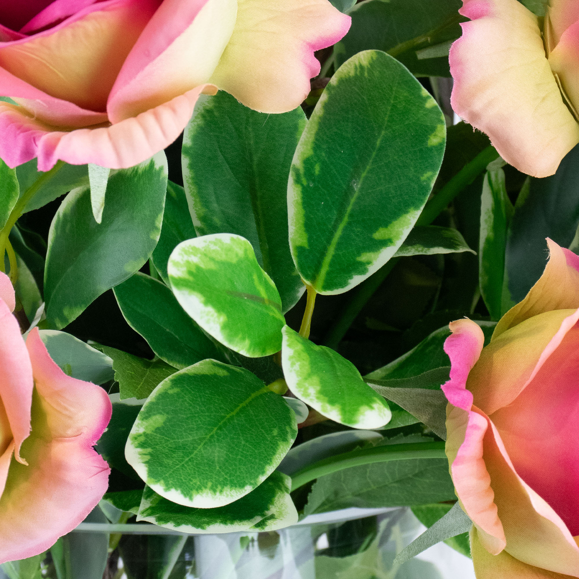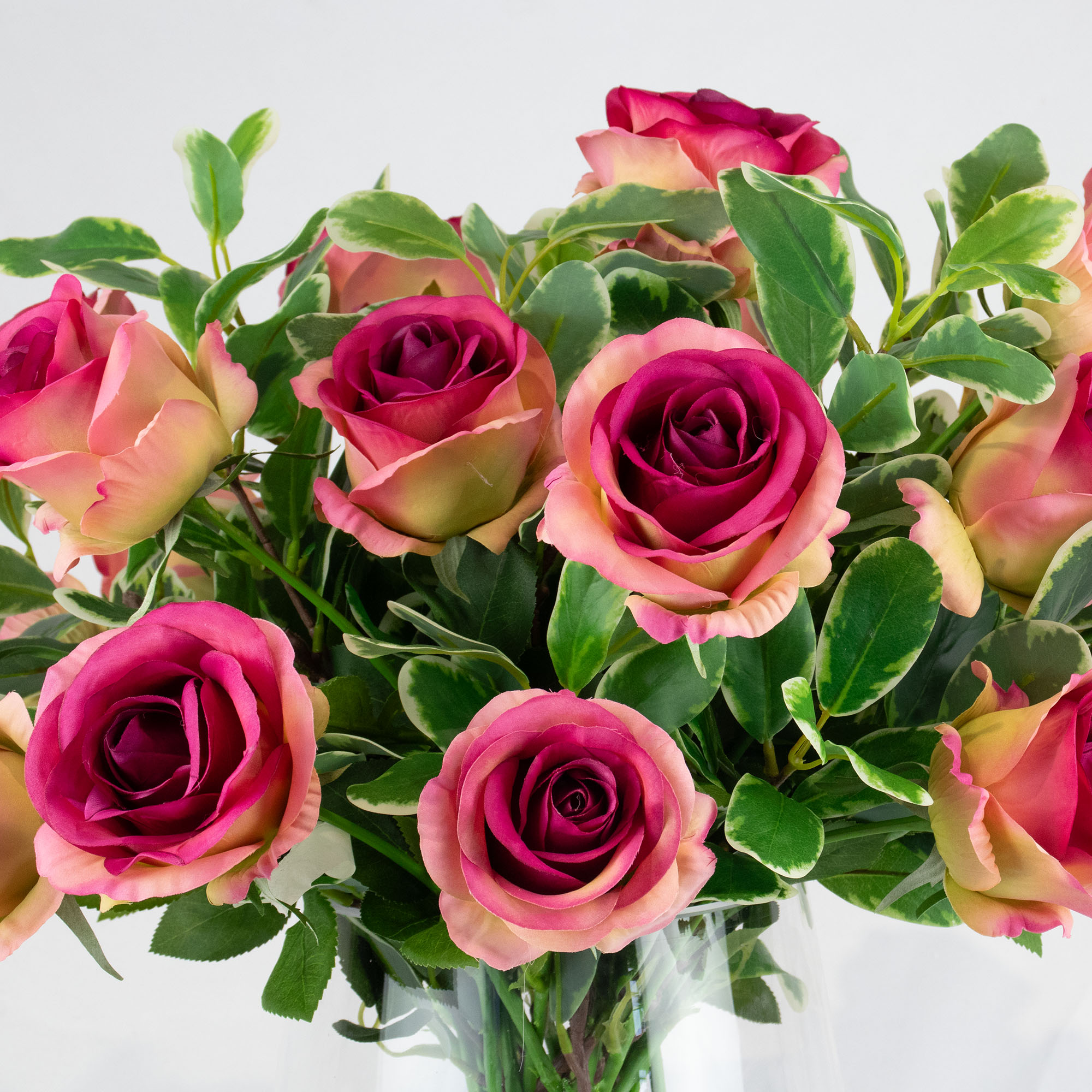 The arrangement stands 55cm tall and 60cm wide. It is filled with realistic fuchsia roses that have a beautiful two-tone petal effect. These are complemented by distinctive green and white variegated azalea leaves, which add depth and texture. We use authentic materials to ensure every detail looks true to life.
