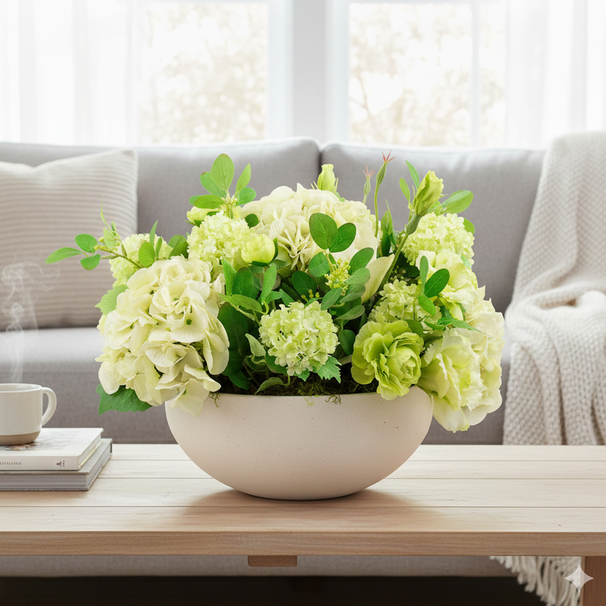 Hydrangeas represent gratitude and heartfelt emotions in many cultures. Tulips are classic symbols of perfect love, and the lime green variety brings a sense of cheerfulness and new beginnings. This arrangement combines green hydrangeas with bright lime tulips for a fresh appearance. Green seed leaves add a soft texture to the display. The artificial silk petals capture the natural beauty of real spring blooms. It brings a calm and welcoming energy to your living space.