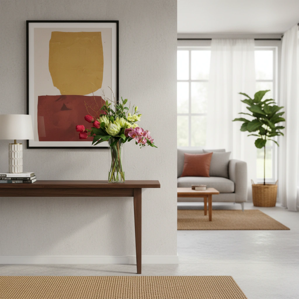 This arrangement has been styled to be front-facing. This is not a 360-degree centrepiece. This feature makes it the perfect choice for placing against a wall. It looks stunning on an entryway console table, a living room sideboard, or a reception desk where it can be fully appreciated from the front.