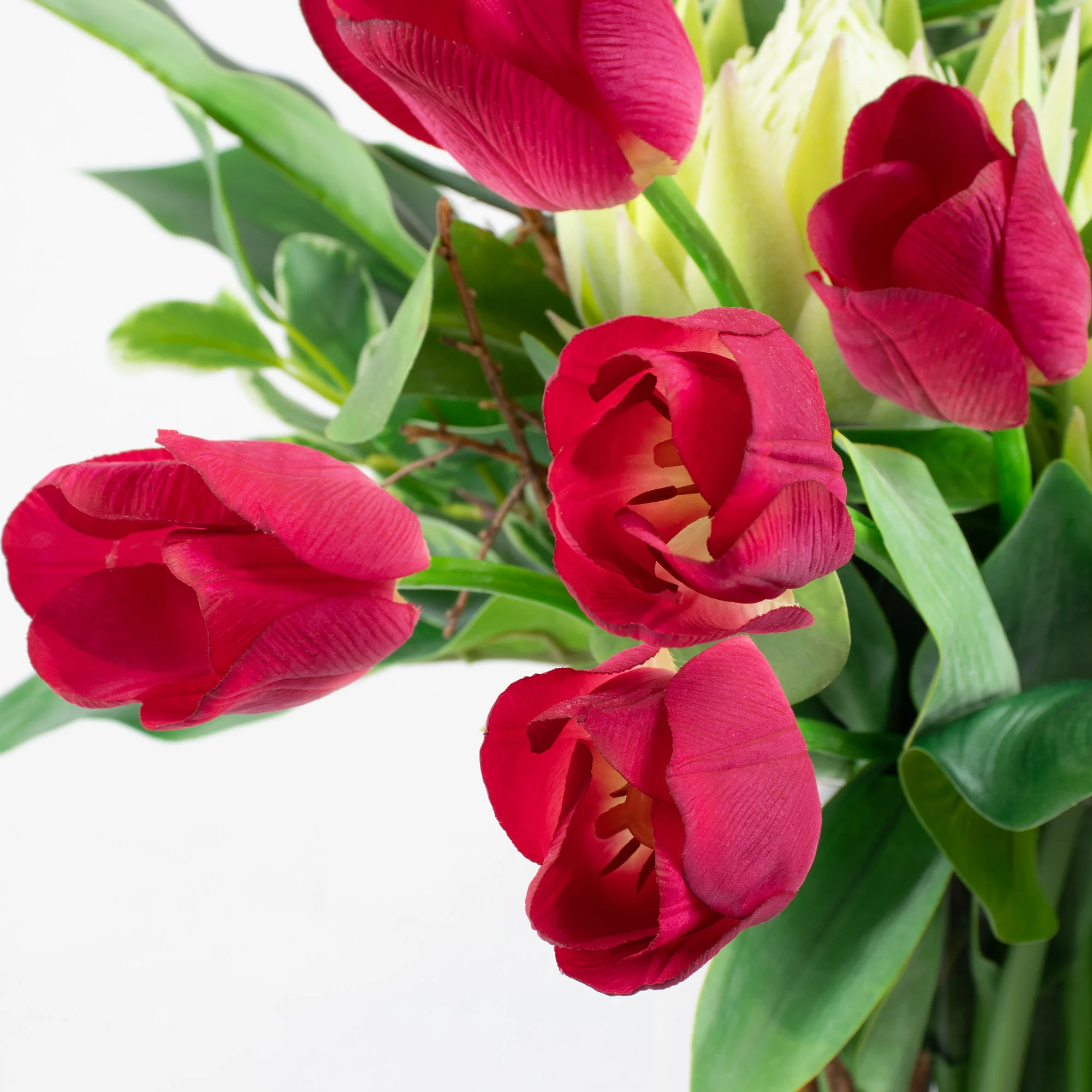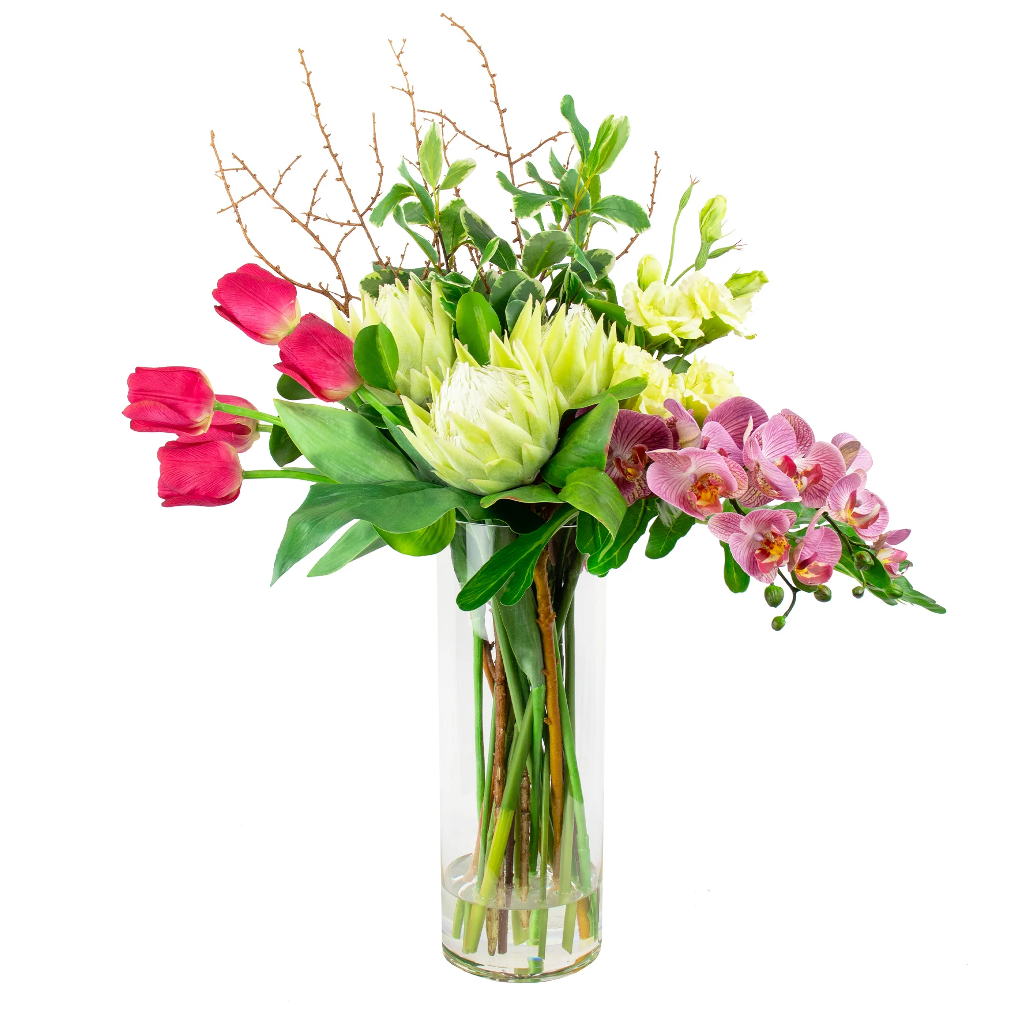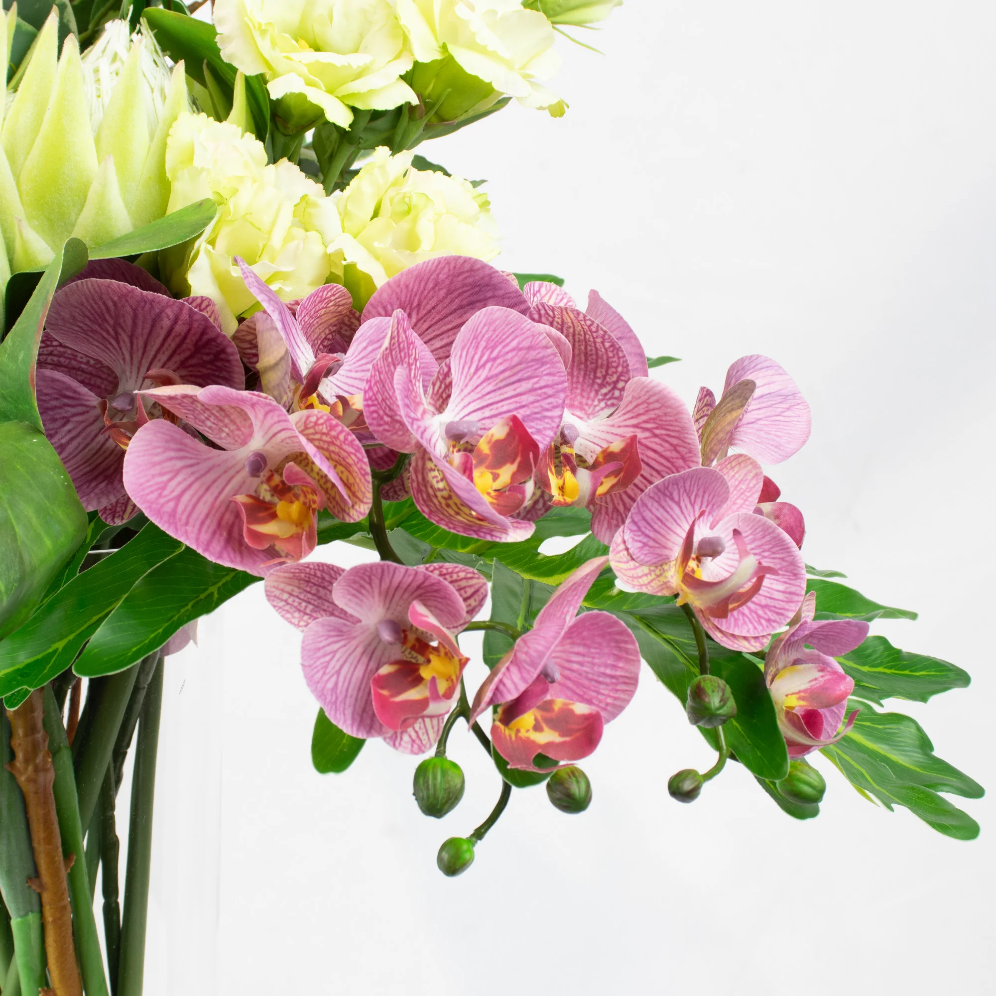 This large arrangement is a creative and sophisticated mix of modern style and bold colour. Standing an impressive 80cm tall, it is designed to be a true statement piece. The display features iconic green proteas, vibrant hot pink tulips, and a beautiful cascading pink Phalaenopsis orchid. These are balanced with fresh greenery and delicate, bare branches for texture.