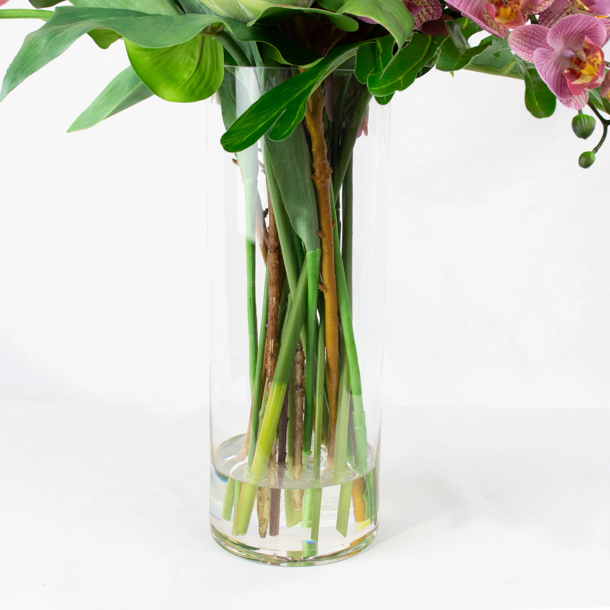 The stems are set in a tall, clear glass cylinder vase (included). A clear, water-like resin at the base holds the entire arrangement securely in place.