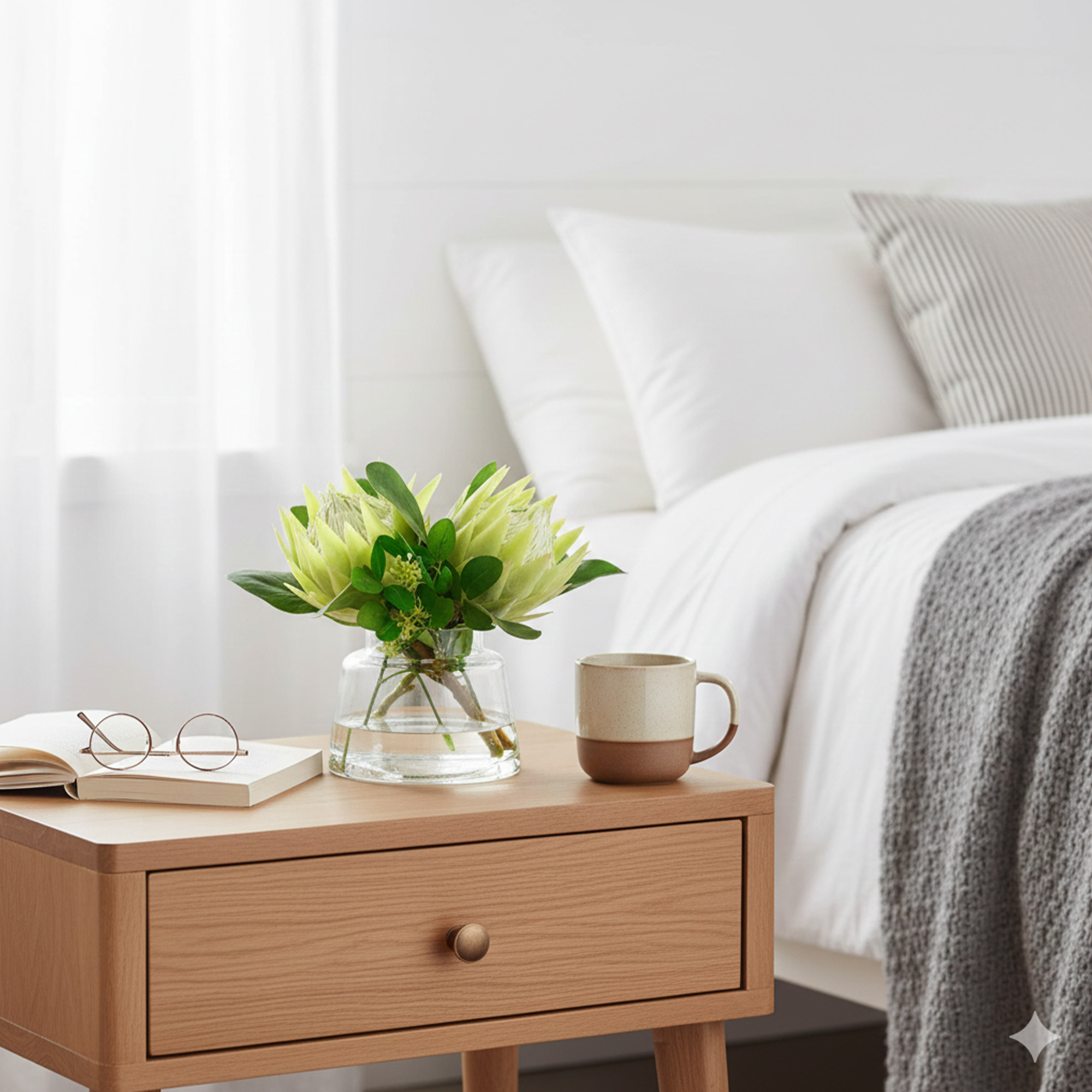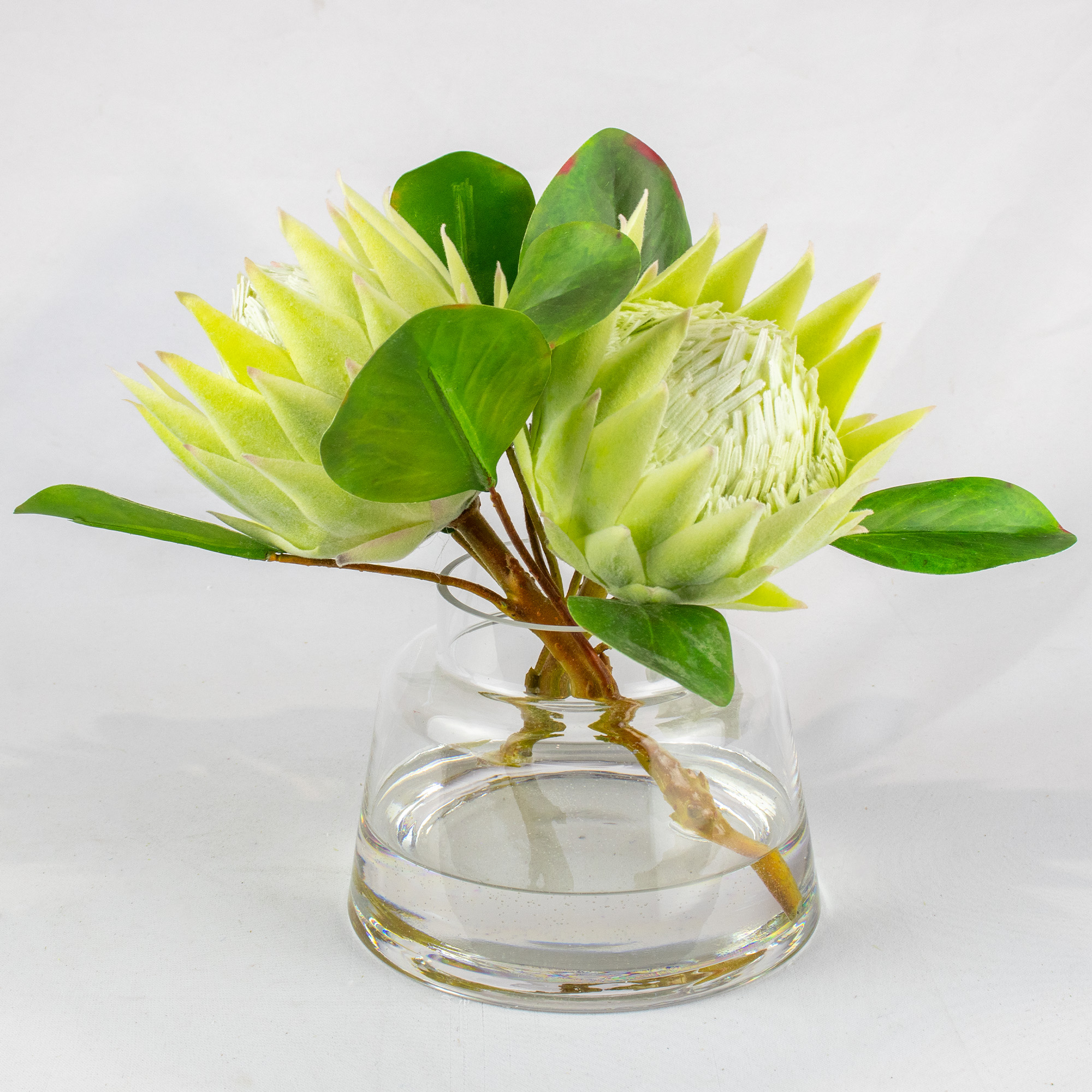 This modern arrangement features two striking green proteas, offering a bold and fresh look. Its main benefit is its unique style and compact size. It brings a creative, contemporary feel to your home and stays looking perfect without any water or upkeep.