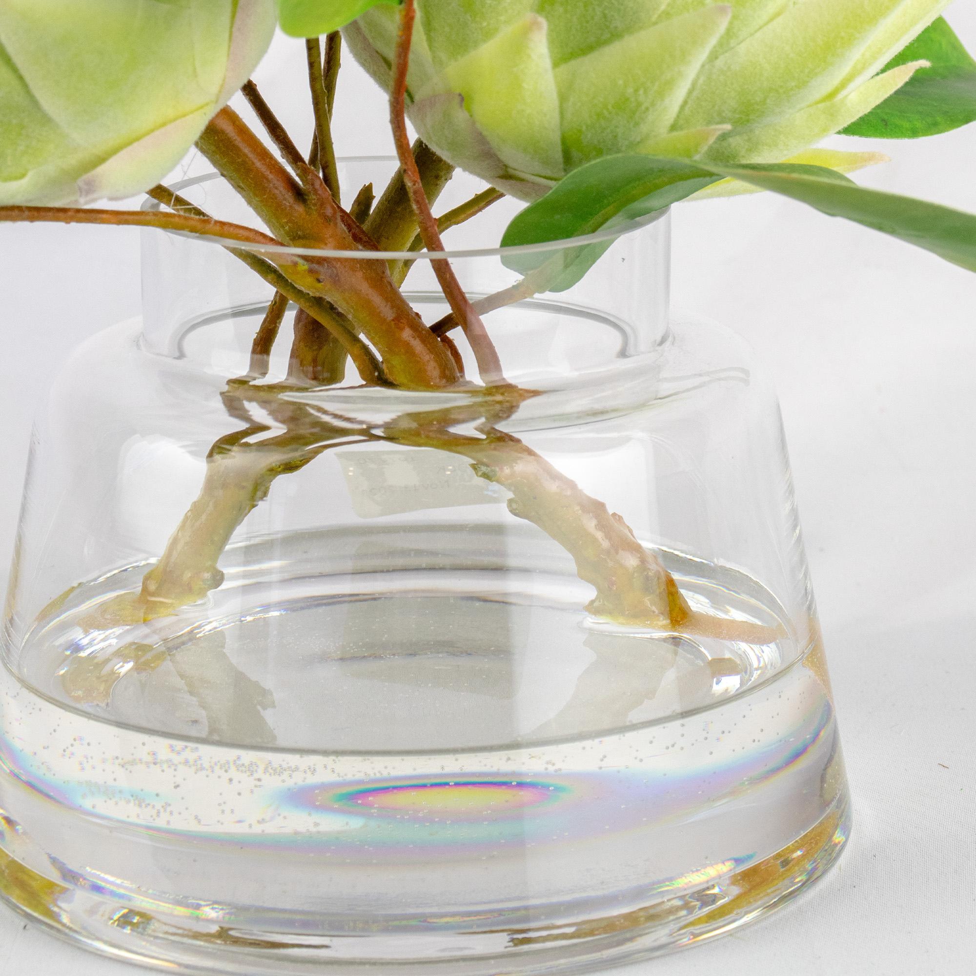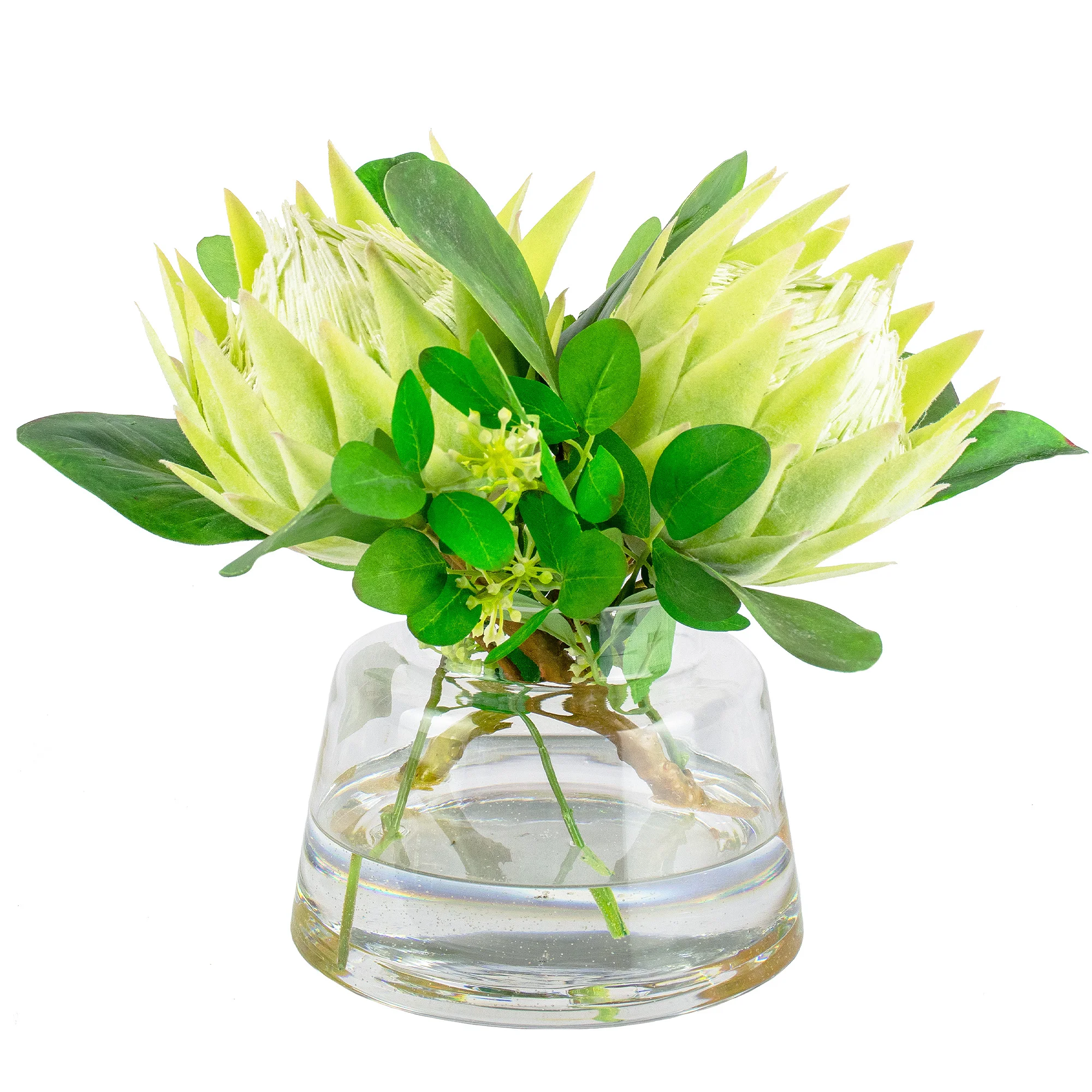 GREEN PROTEAS WITH FOLIAGE IN JAR VASE