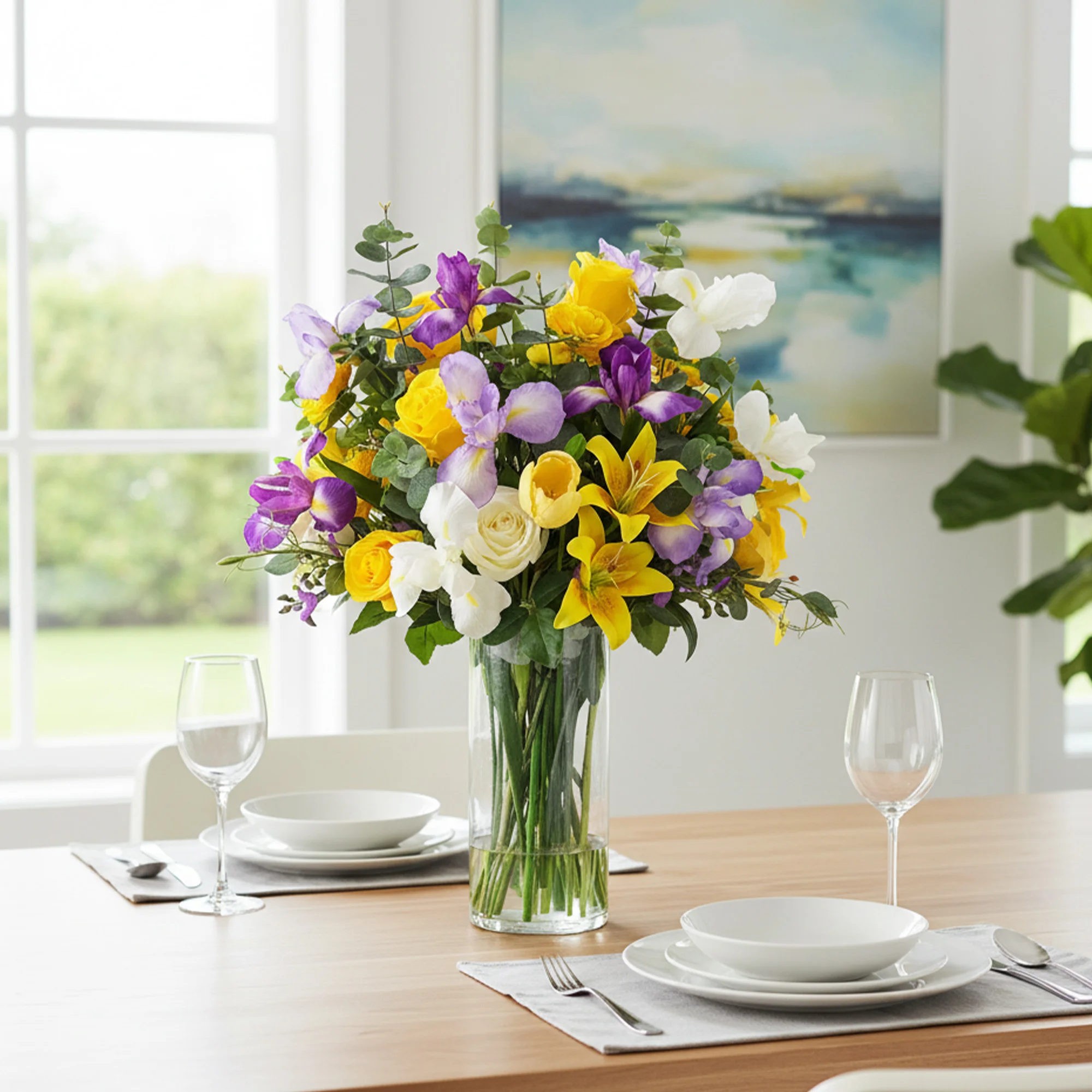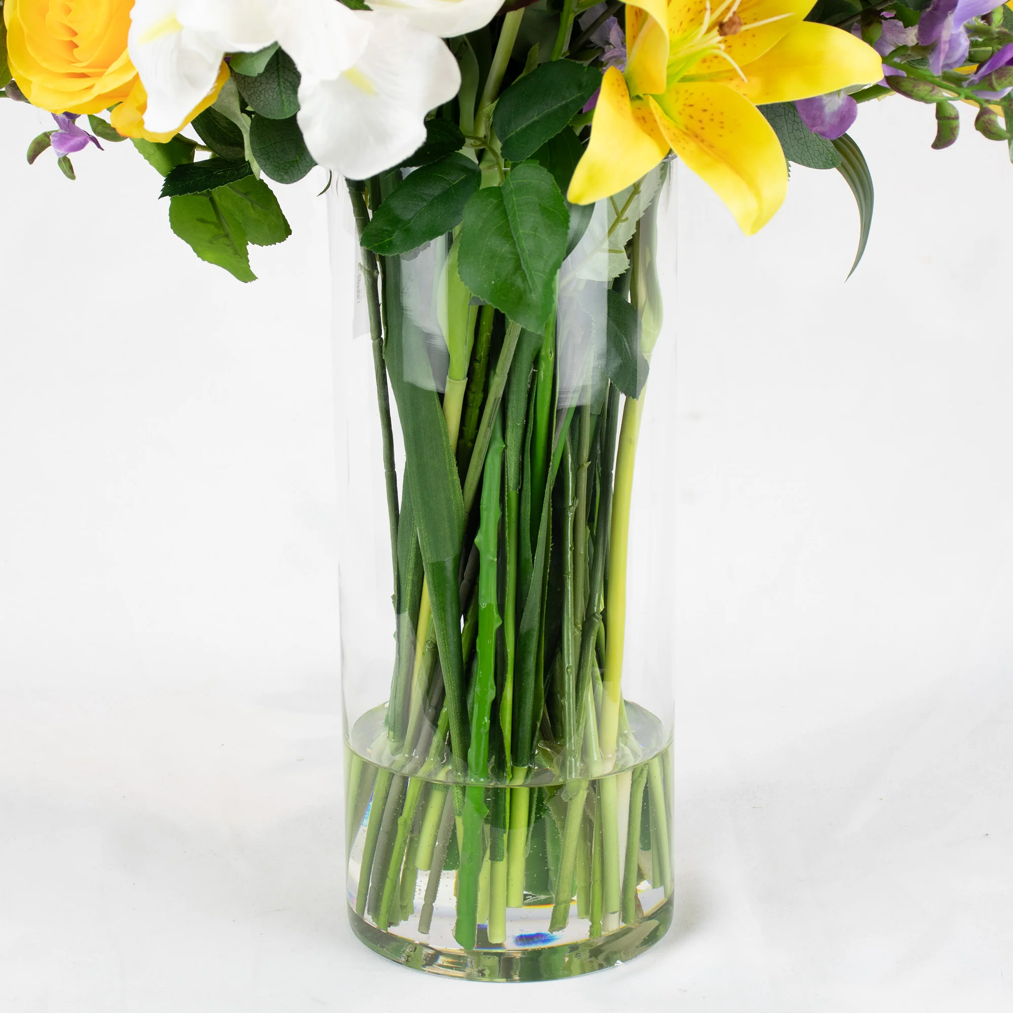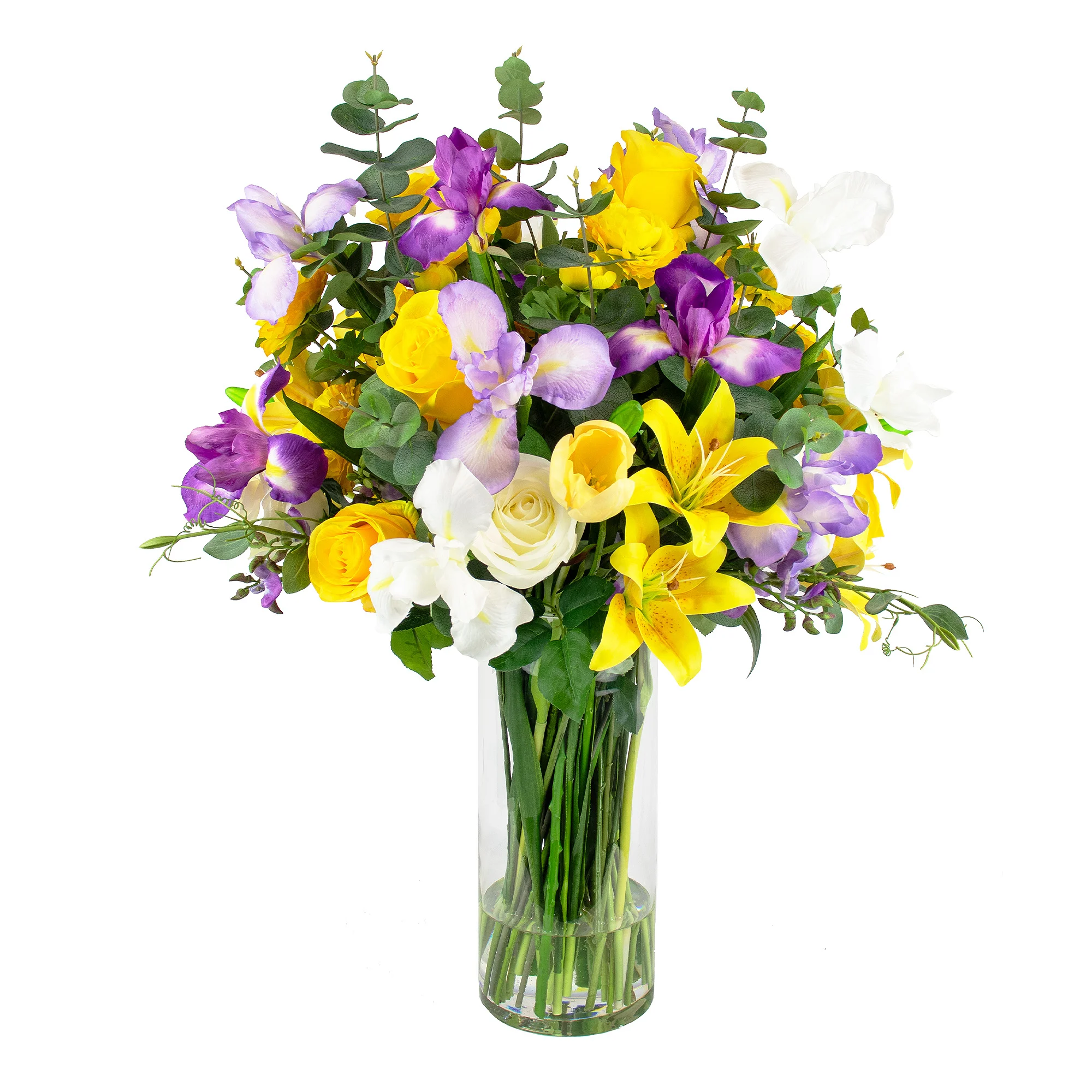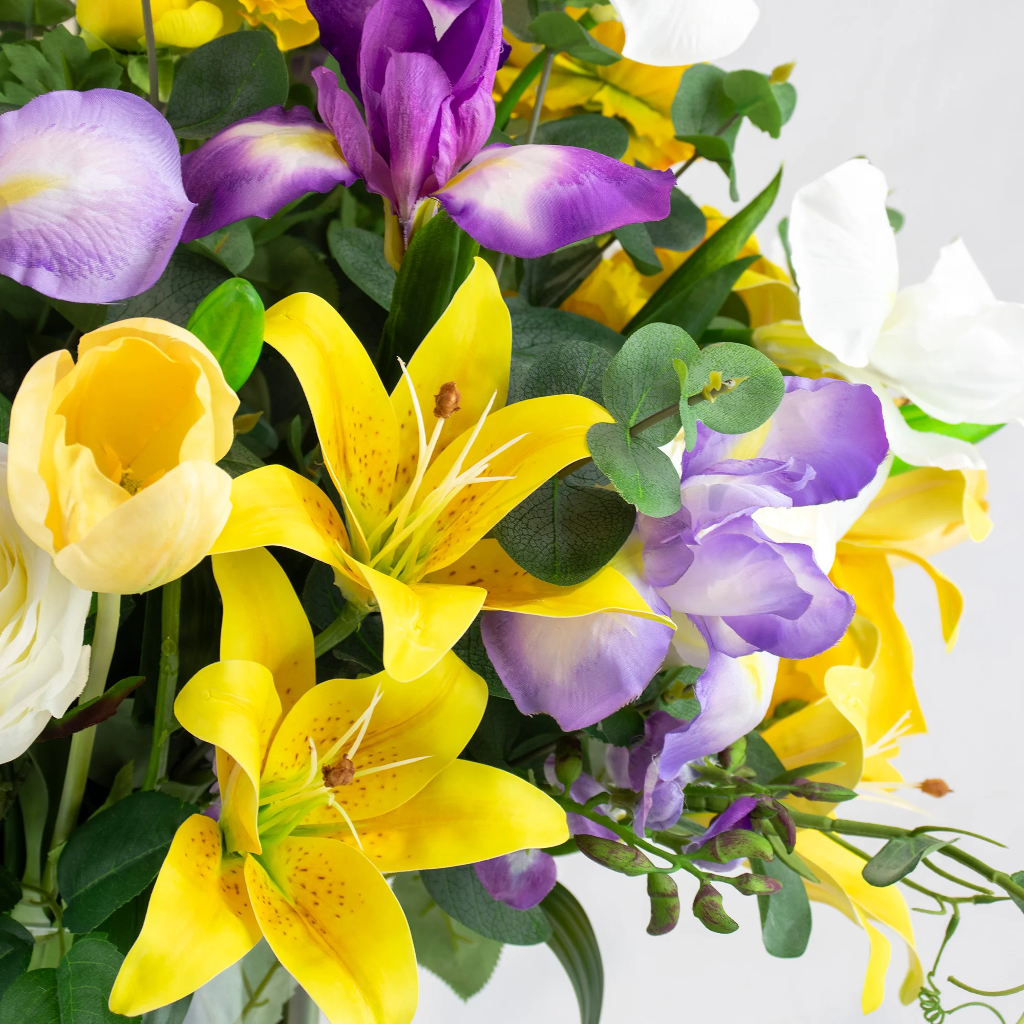 This large arrangement is full of life and bright, happy colour. It stands an impressive 77cm tall, making it a true statement piece. The design features a striking mix of purple iris, sunny yellow roses, and bright yellow lilies. These are balanced with white roses, hints of freesia, and fresh green eucalyptus leaves. The flowers are set in a classic, tall glass cylinder vase.