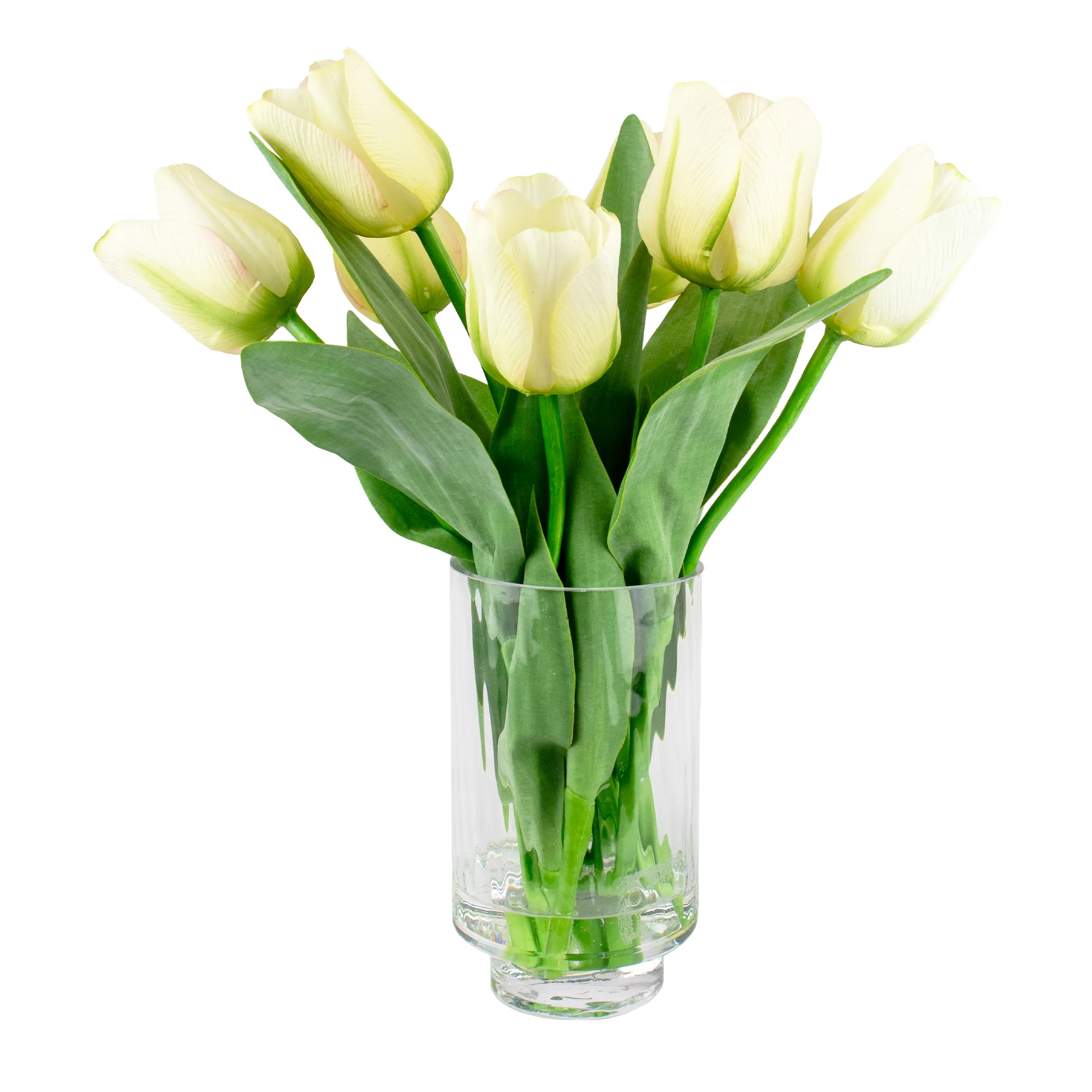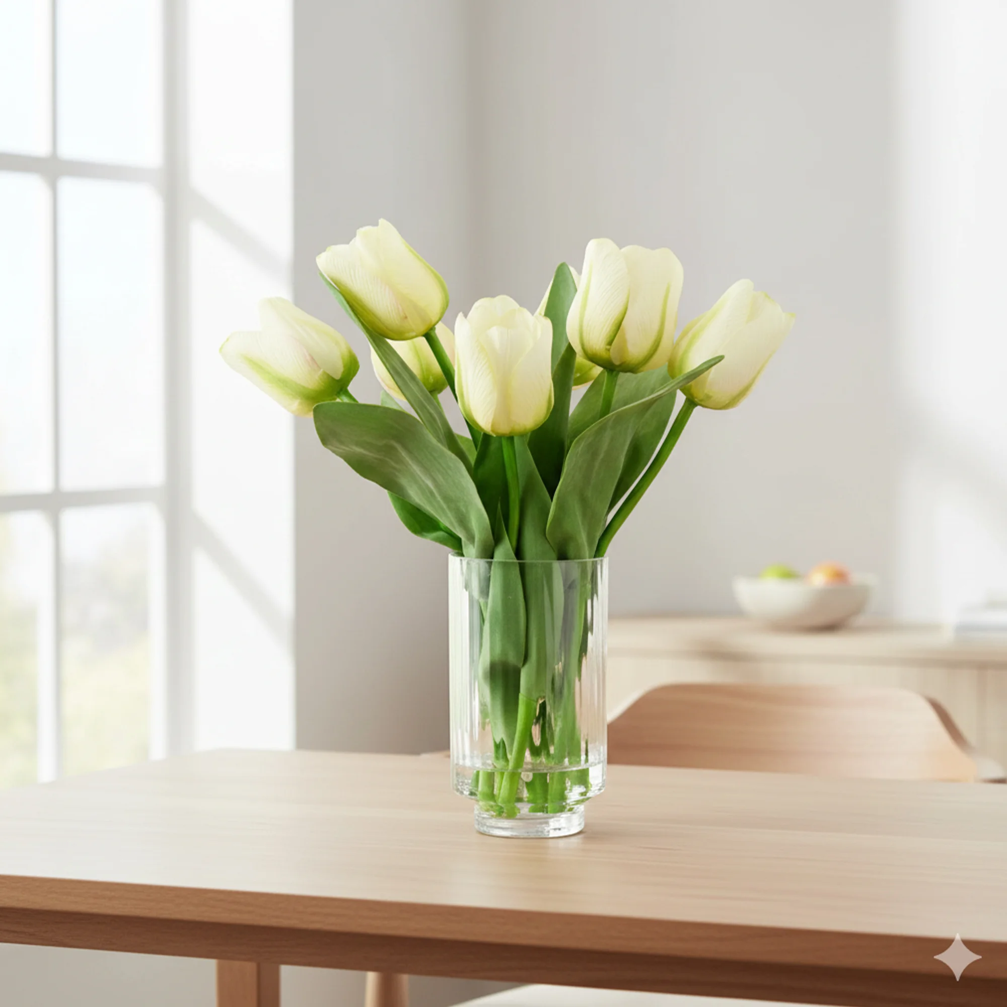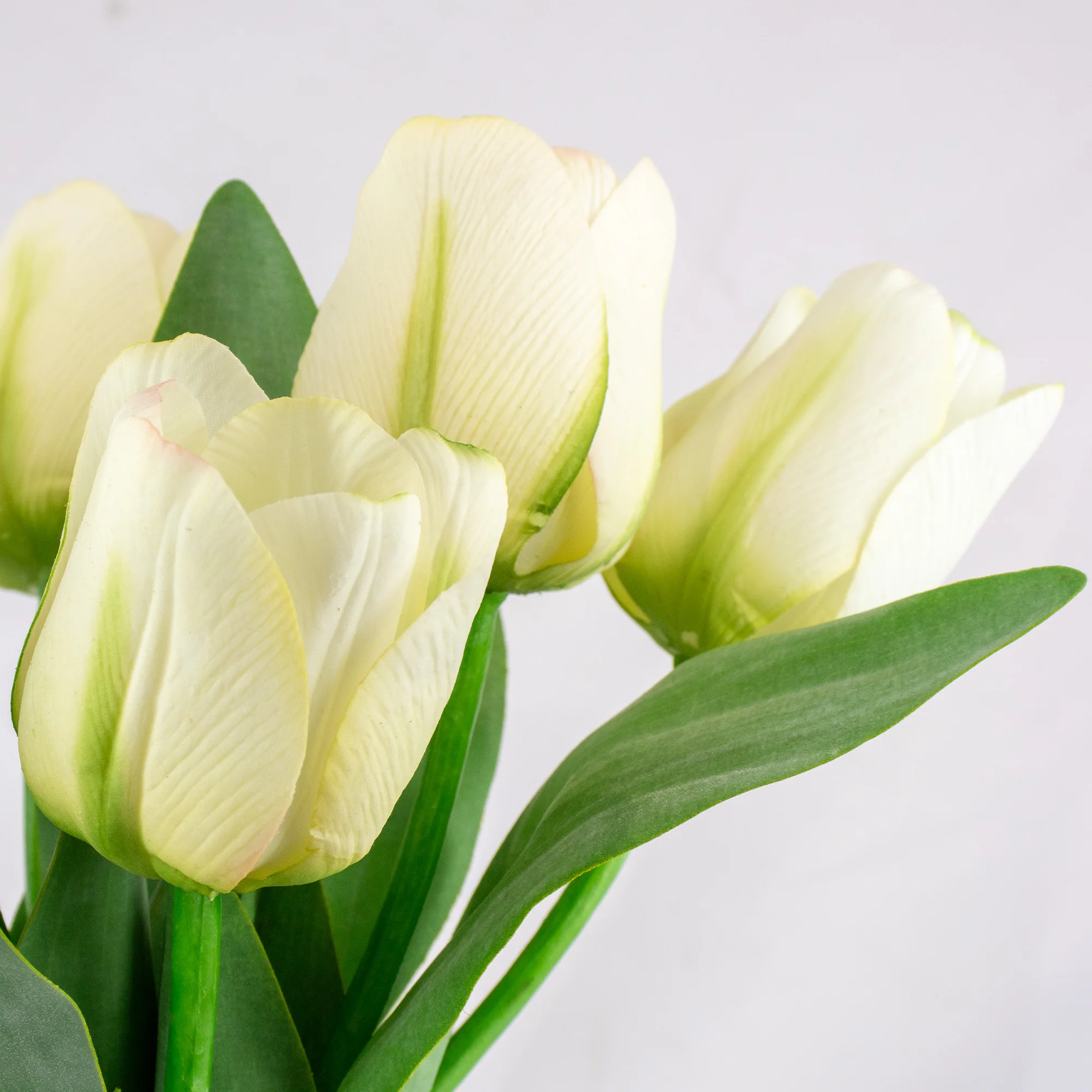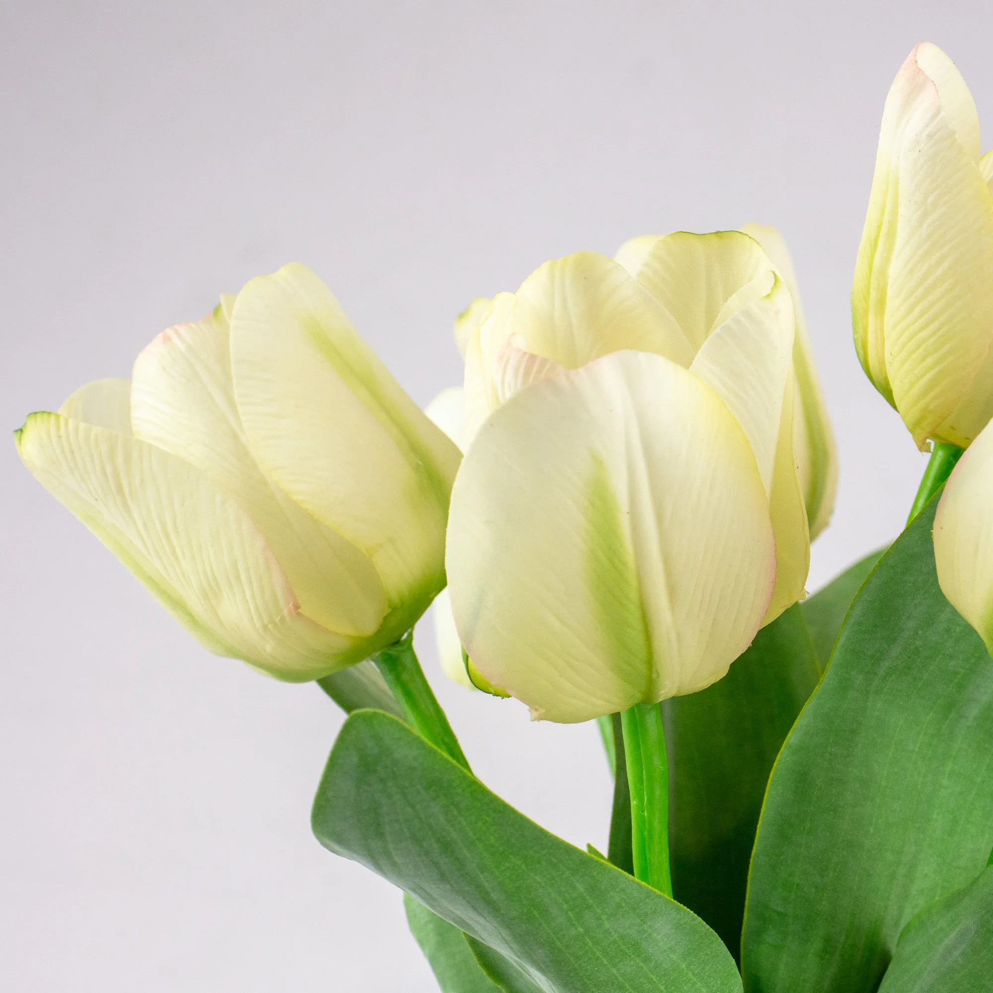 This elegant spring floral display features a generous bunch of lime-coloured tulips. Its main benefit is its fresh, spring-like appeal that lasts all year round. The crisp lime green colour brings a bright, energetic feel to any room without the need for water or sunlight.