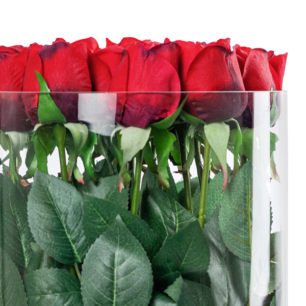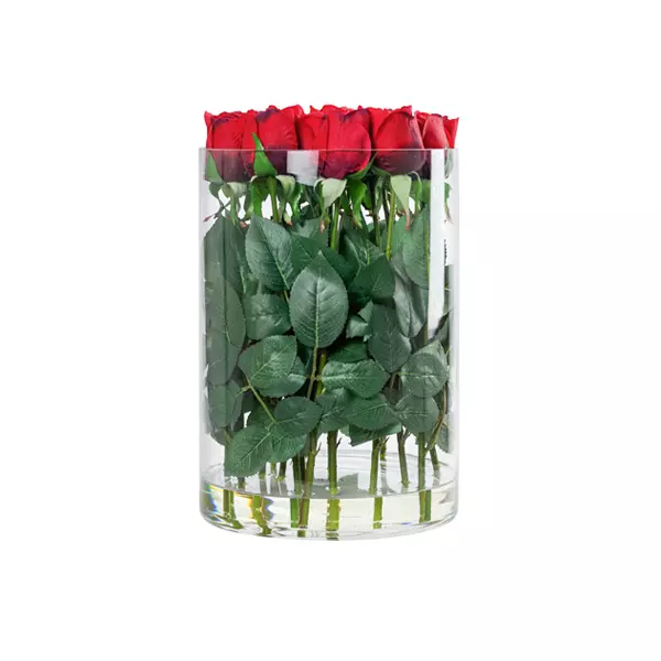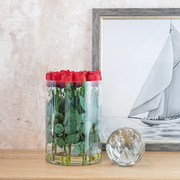 Red artificial silk Lisa Roses set in a clear cylinder glass vase.