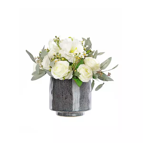 Mixed artificial Lisianthus with Roses set in a grey ceramic vase.
