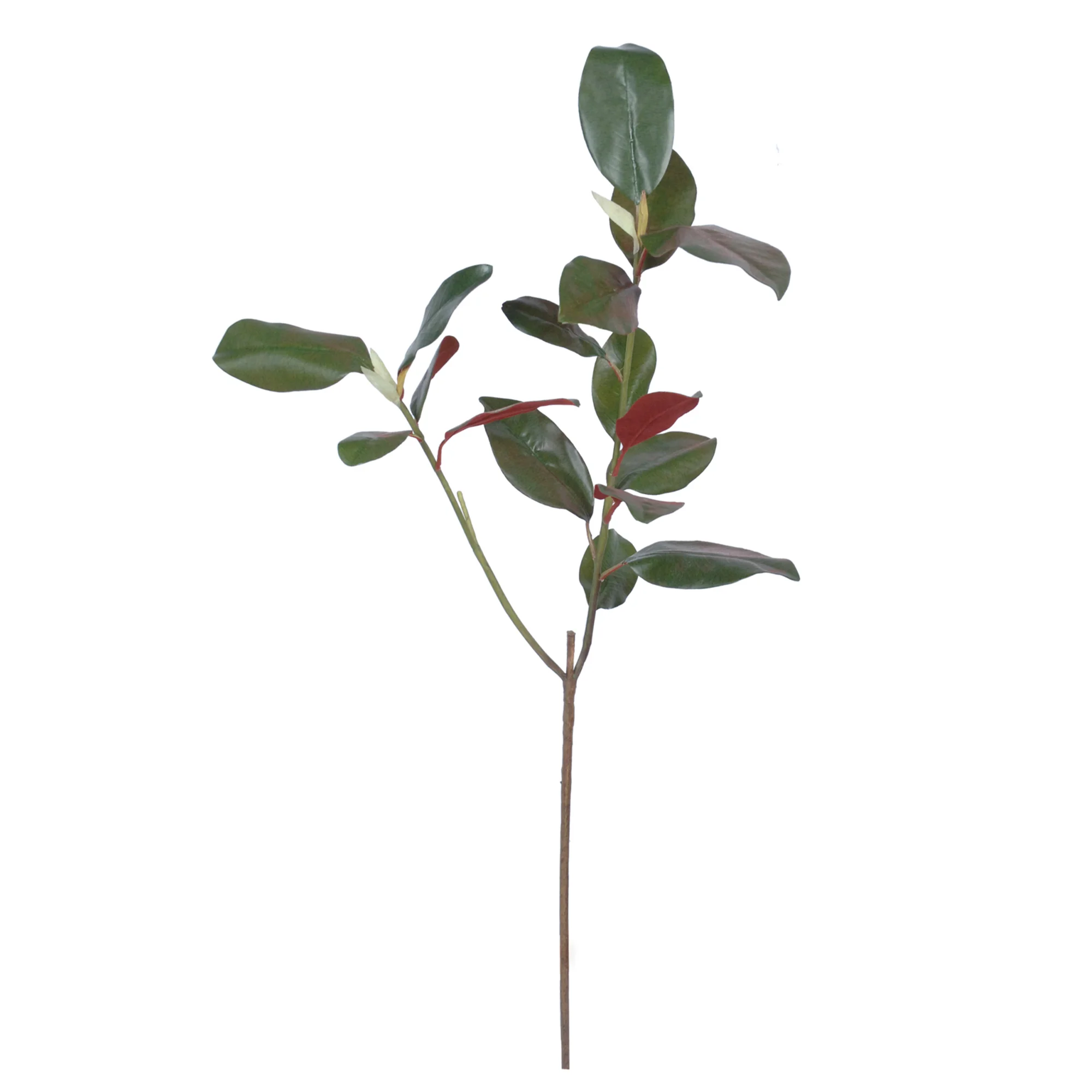 The spray measures an impressive 88cm in length and splits into two sturdy branches, providing excellent coverage and volume. The leaves are meticulously designed with a dark, glossy green upper surface and a realistic matte crimson underside. This dual-colour effect mimics the natural beauty of the magnolia leaf, adding warmth and texture to any display.