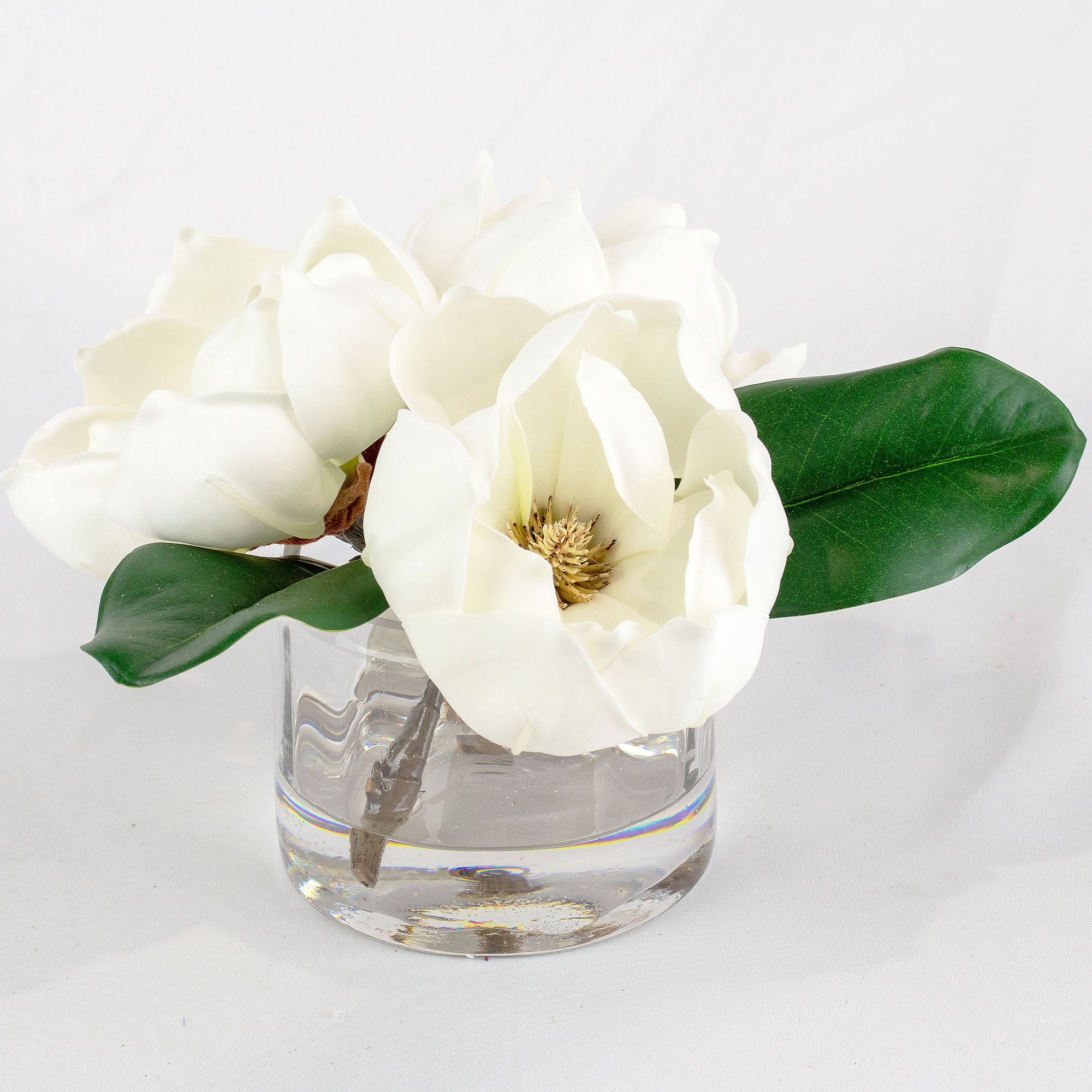 This elegant, low-profile arrangement features three beautiful magnolia flowers. Its main benefit is its small, view-friendly size. Standing just 18cm tall, it is the perfect sophisticated centrepiece for a coffee table or dining table, as it does not block the view of guests.