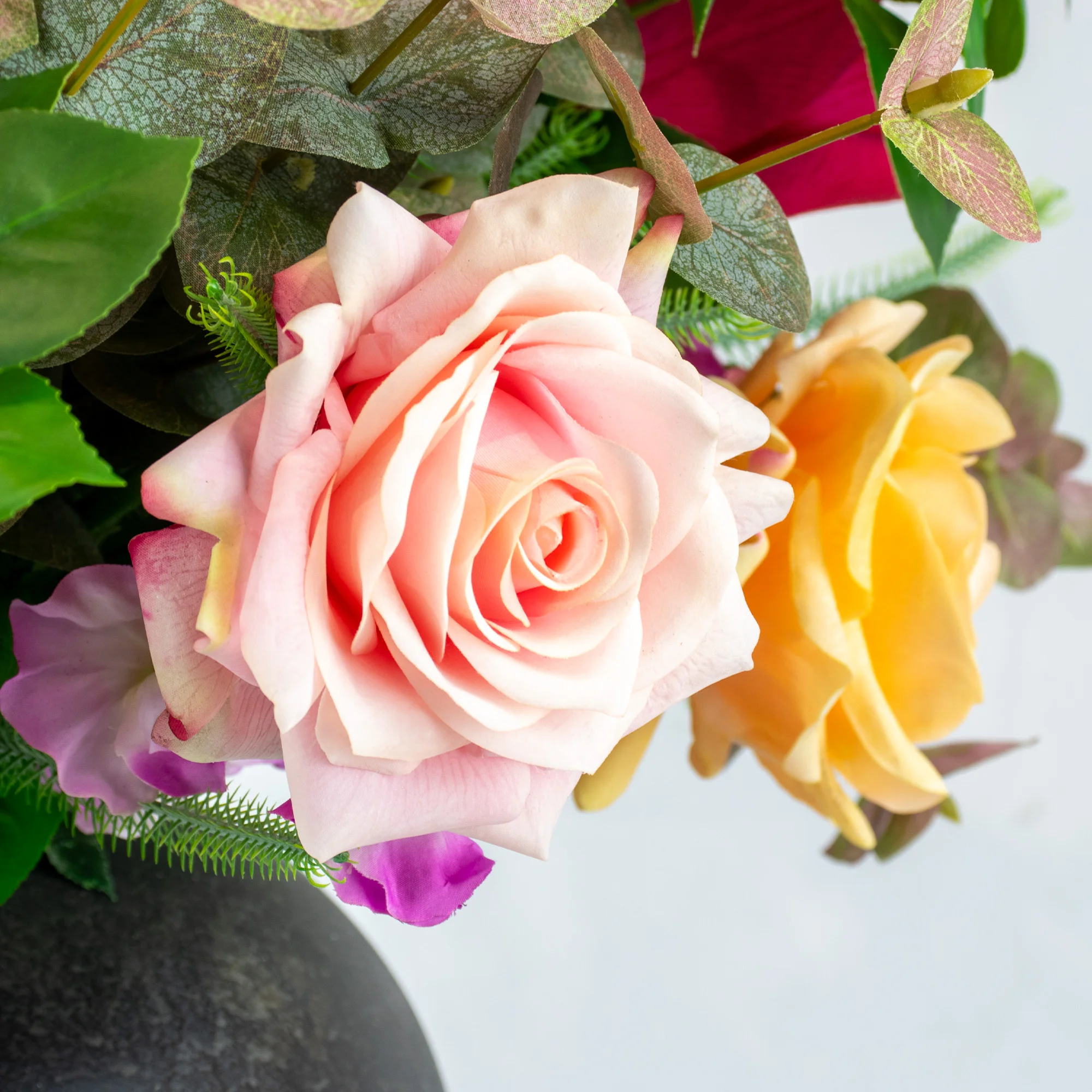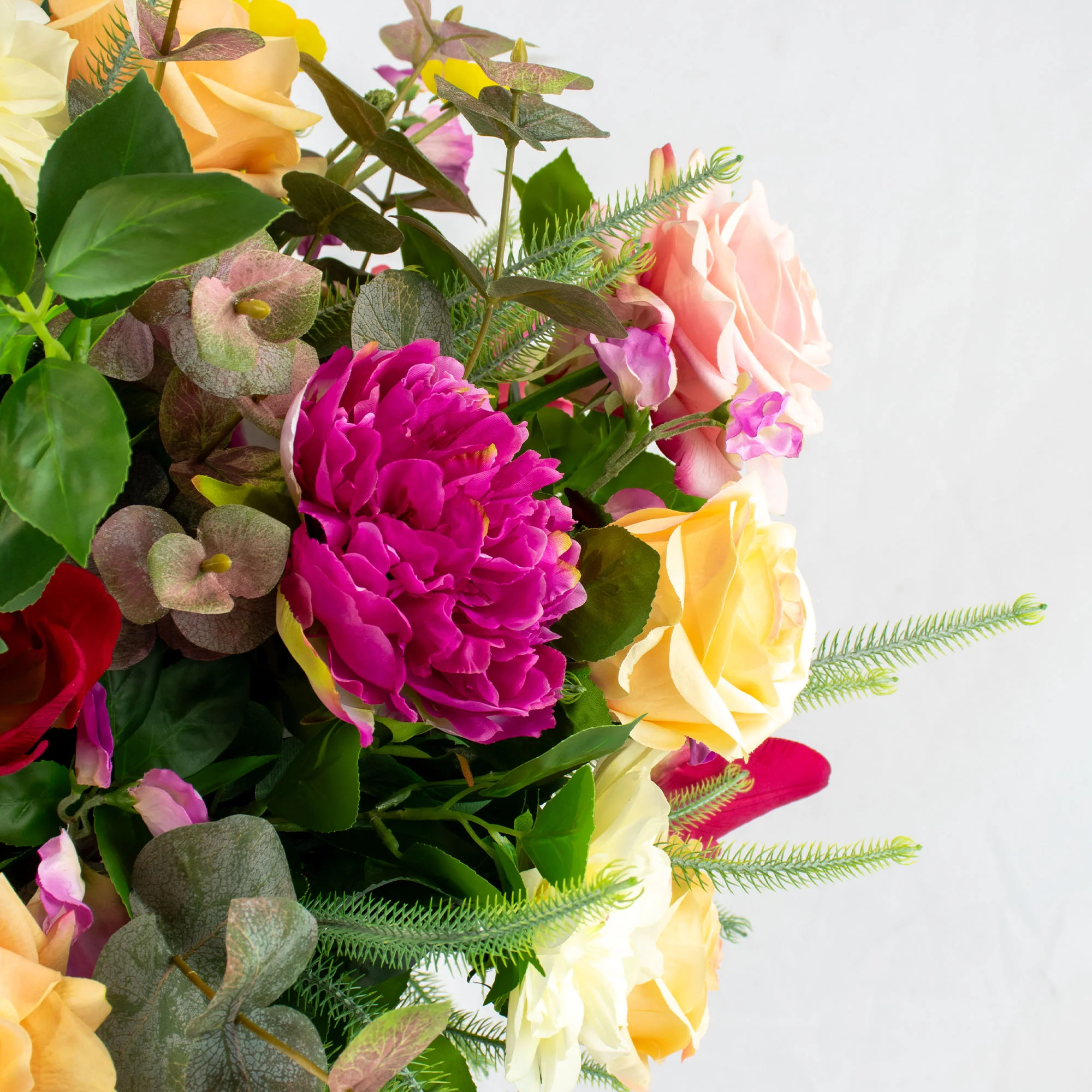 This large arrangement is a true celebration of colour and texture. It is a stunning statement piece, standing 75cm tall. The design features a vibrant mix of high-quality artificial flowers. You will find bright roses, full dahlias, delicate peonies, tulips, sweet peas, and cheerful buttercups. A mixed bouquet with so many colours often represents joy, celebration, and friendship. It is an inspirational piece that brings a friendly and welcoming feel to any room.