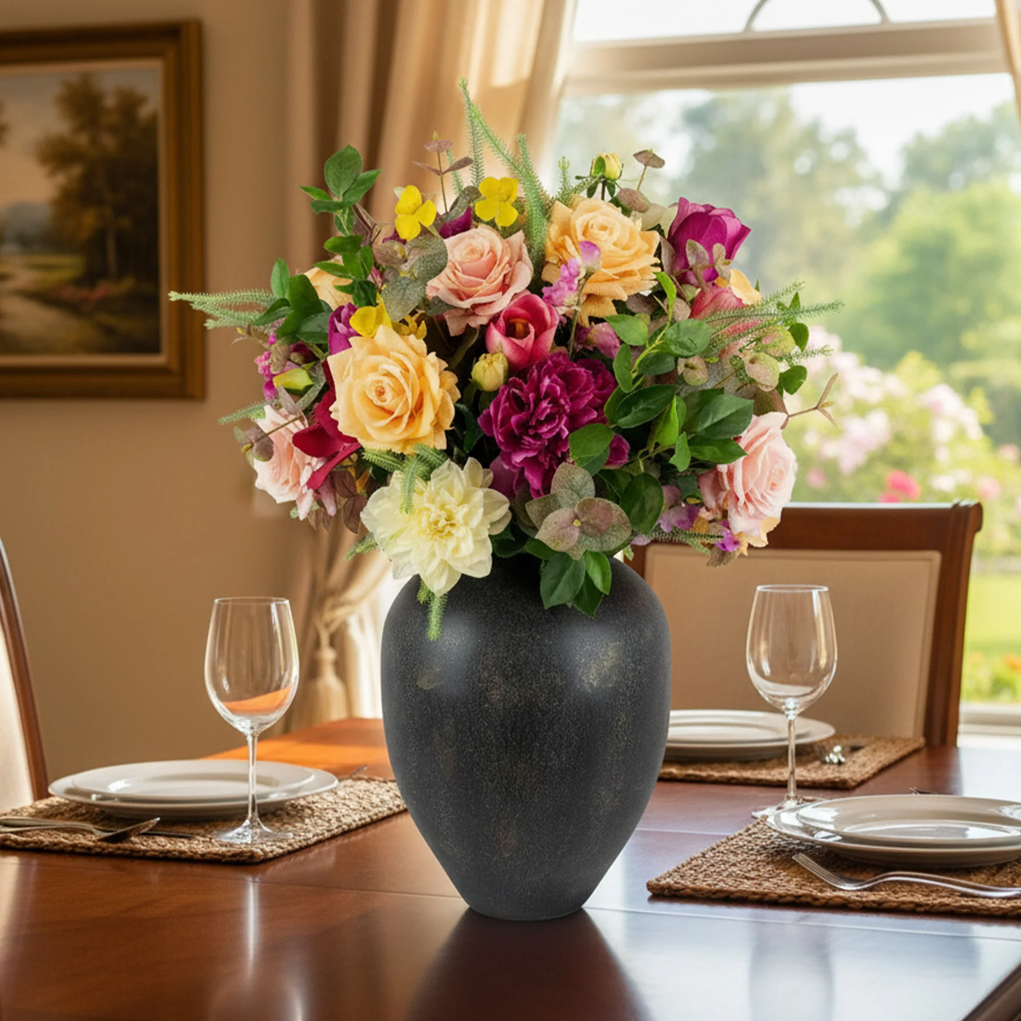 This piece provides all the "wow" factor with no effort. It is a reliable and impressive centrepiece that stays bright and beautiful all year. It requires no water or special care.