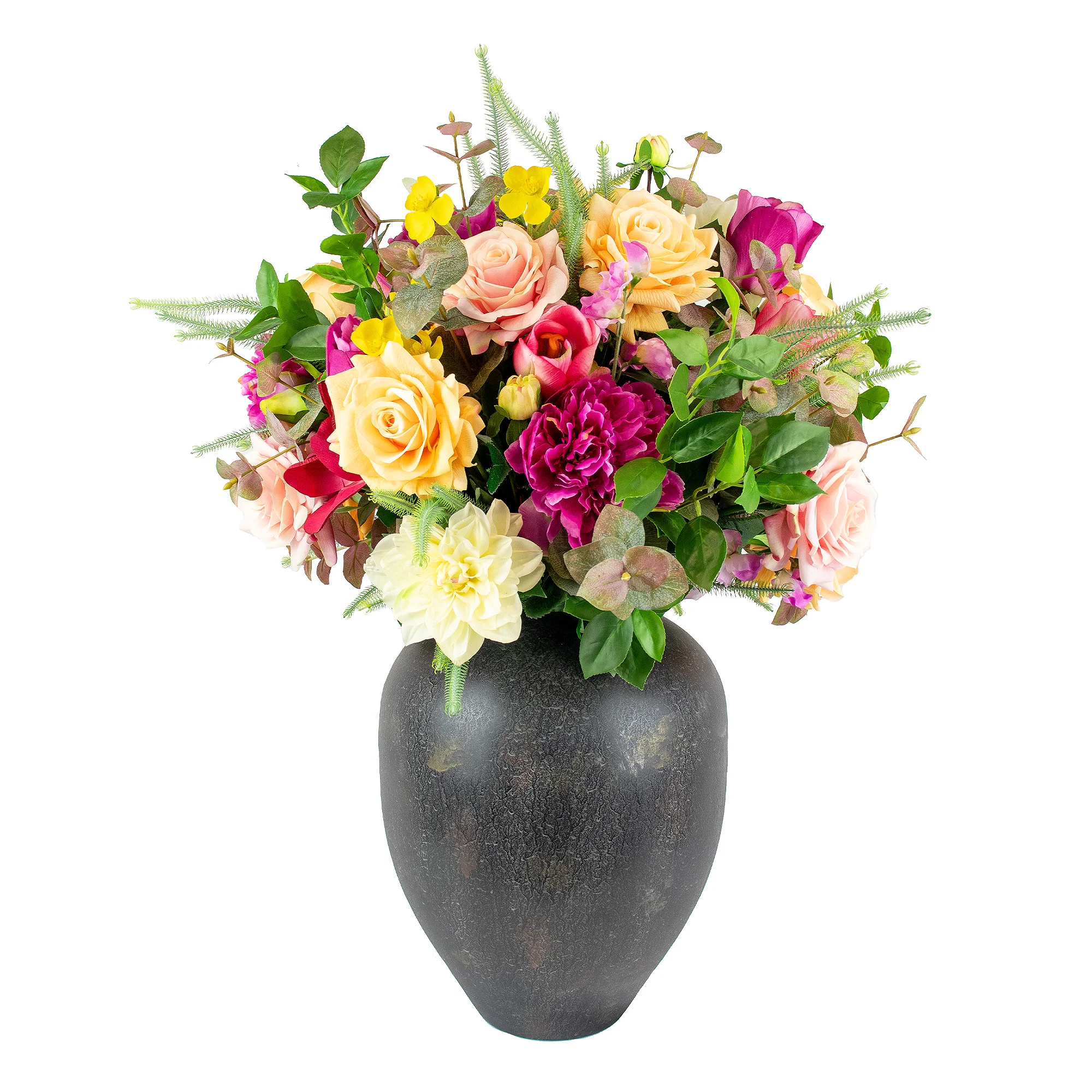 The bright flowers are mixed with a variety of green foliage, including eucalyptus, araucaria, and ficus leaves. This creates a full, natural, and creative look. The flowers are set in a large, dark iron jar. The textured, rustic finish of the vase provides a sophisticated contrast to the bright, soft petals.
