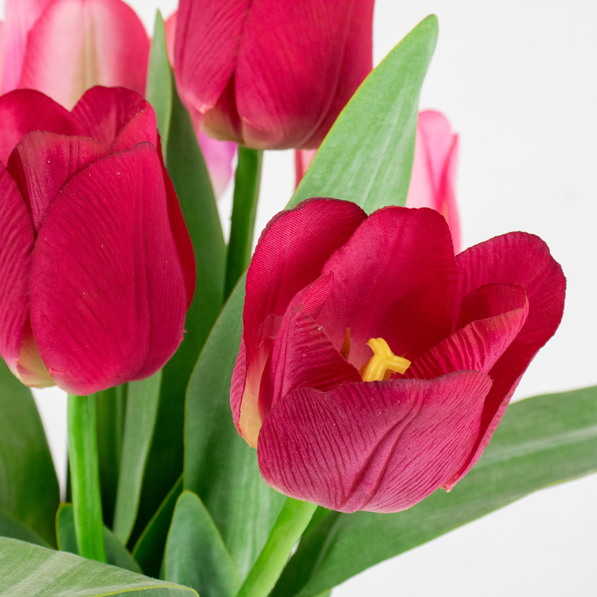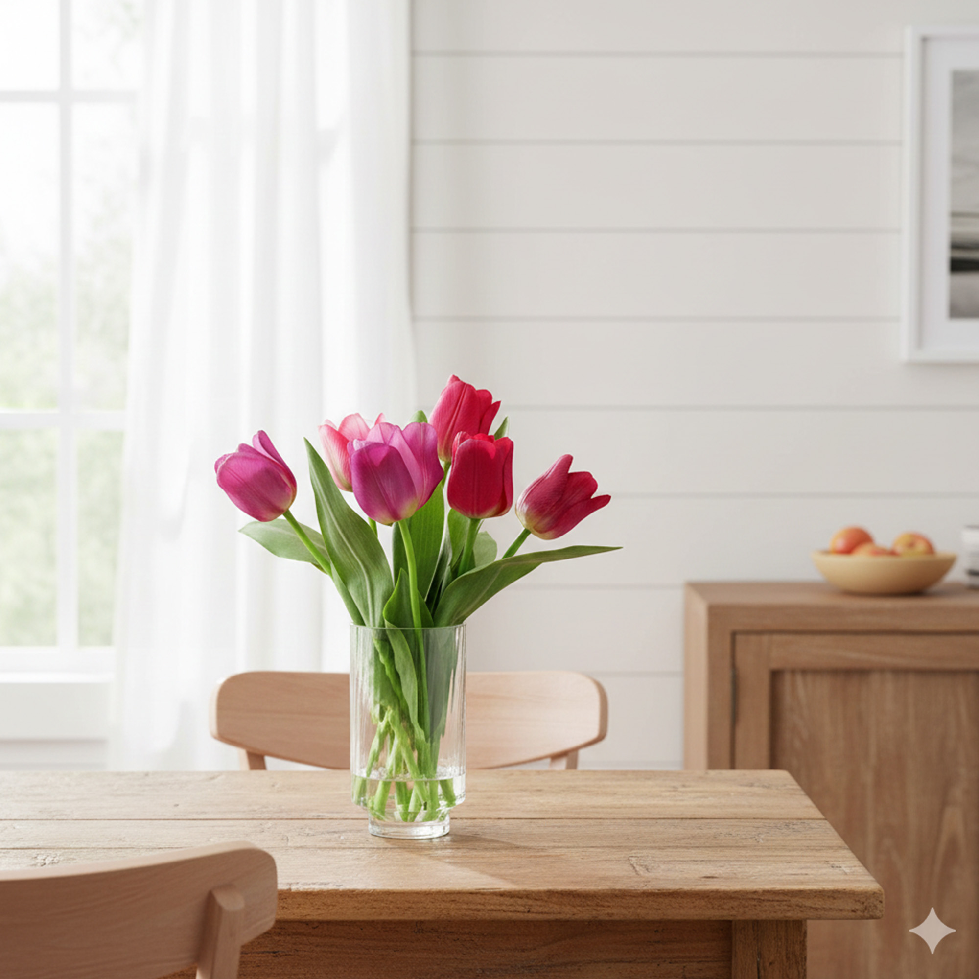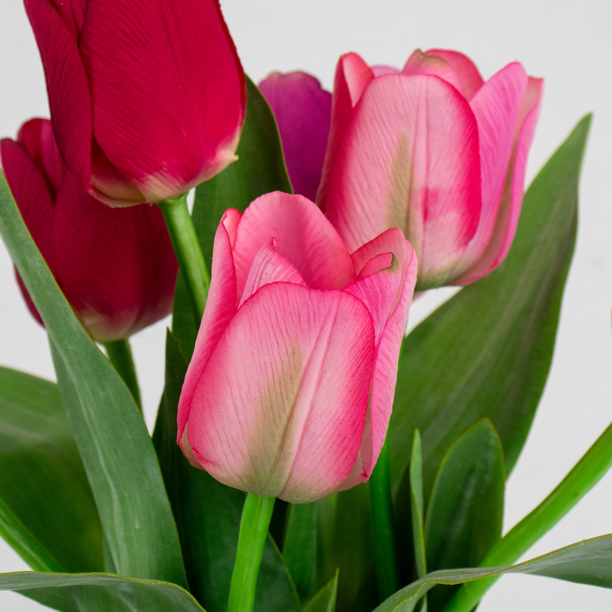 This vibrant arrangement features a joyful mix of pink tulips in various shades. Its main benefit is bringing the fresh, colourful energy of spring into your home all year round. The bright blooms offer a reliable and sophisticated pop of colour that never fades or needs water.