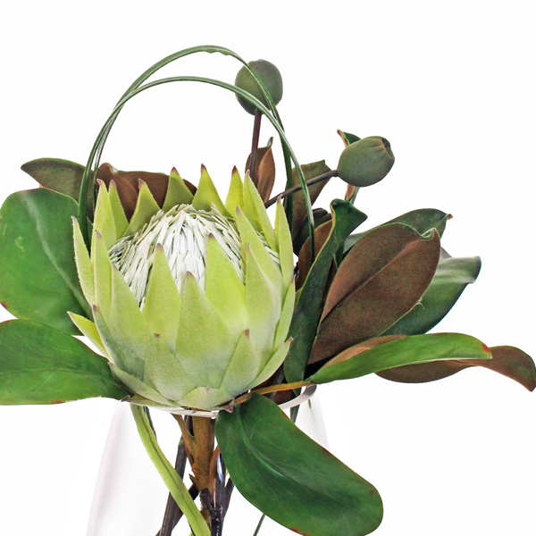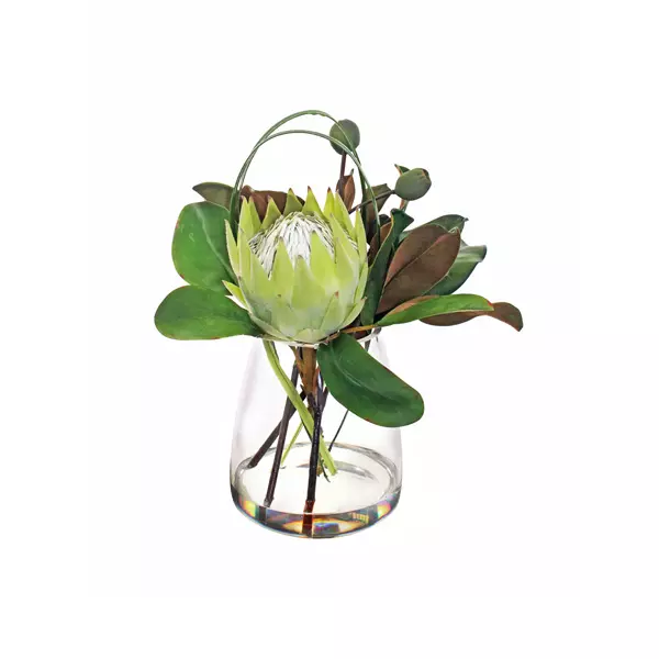 Mixed artificial silk Protea spray & Magnolia leaves set in a clear glass vase.