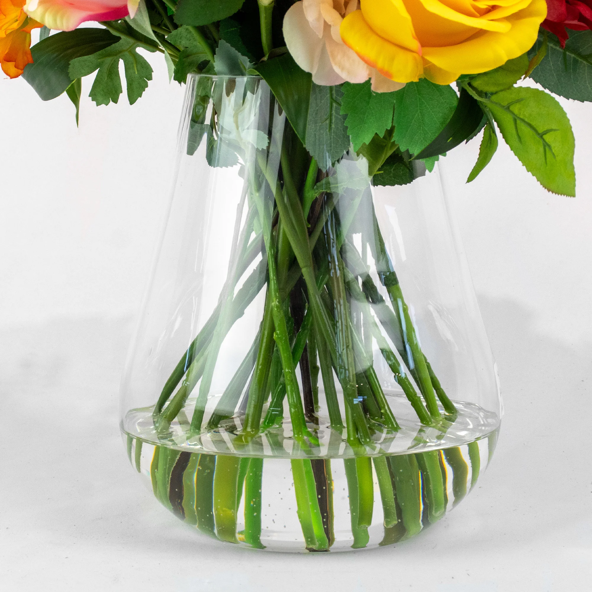 This medium-sized arrangement measures 55cm tall and 55cm wide. It fits perfectly on a central dining table or a large reception desk. Boutique hotels and spas use these vibrant displays to welcome guests warmly. This piece is a popular choice for our hospitality segment and trade customers with brick-and-mortar retail outlets. The flowers sit securely in a clear, tulip-shaped glass vase. A solid resin holds the stems firmly in place and looks exactly like real water.