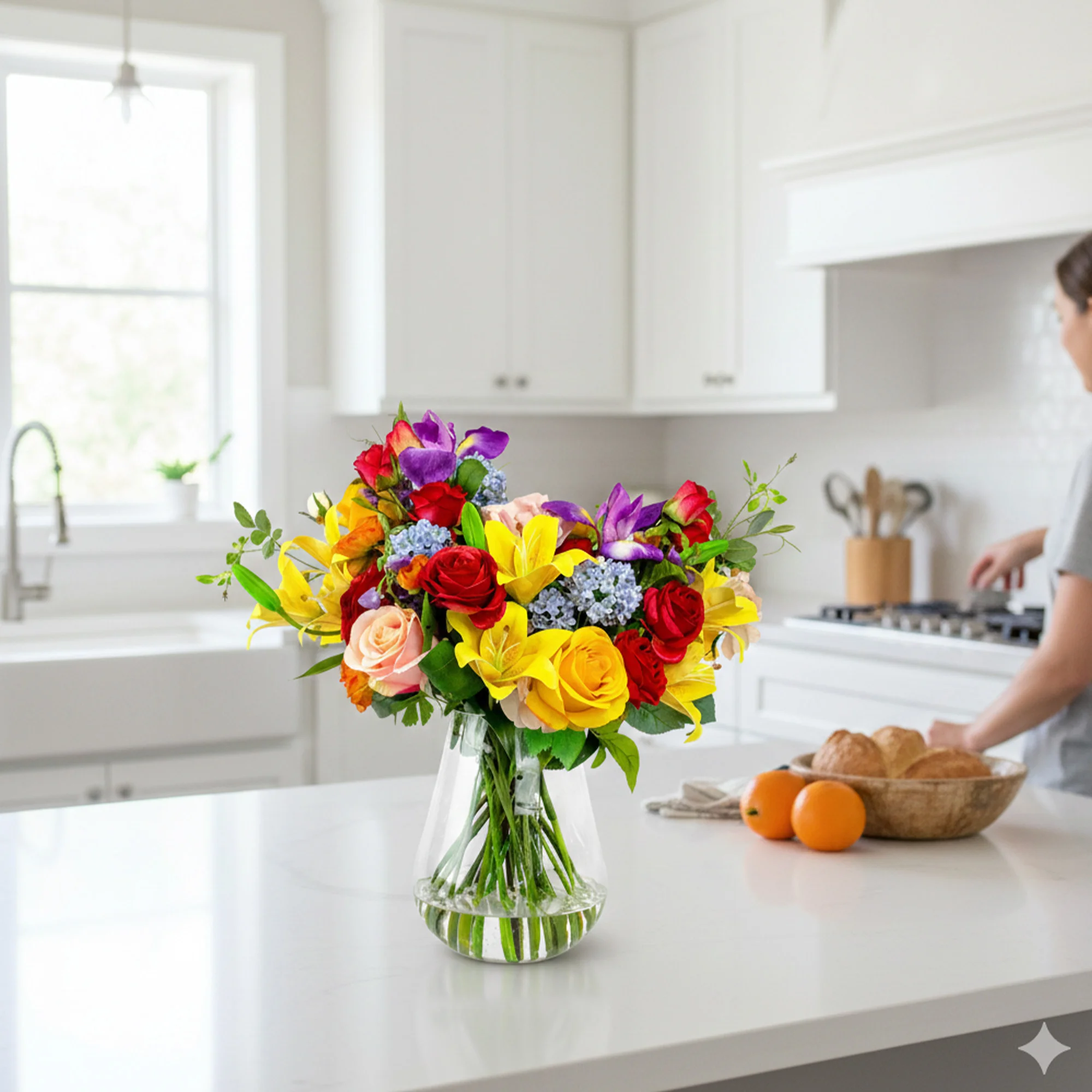 Roses are classic symbols of love and beauty across the world. Tiger lilies represent confidence and prosperity in many cultures. This colourful arrangement combines red roses, yellow tiger lilies, tulips, ranunculus, and snowball flowers. The mixed purple blooms add a deep contrast to the bright reds and yellows. This lively mix brings a joyful and welcoming energy to any room. The artificial flowers are crafted carefully to capture the exact look of fresh petals.
