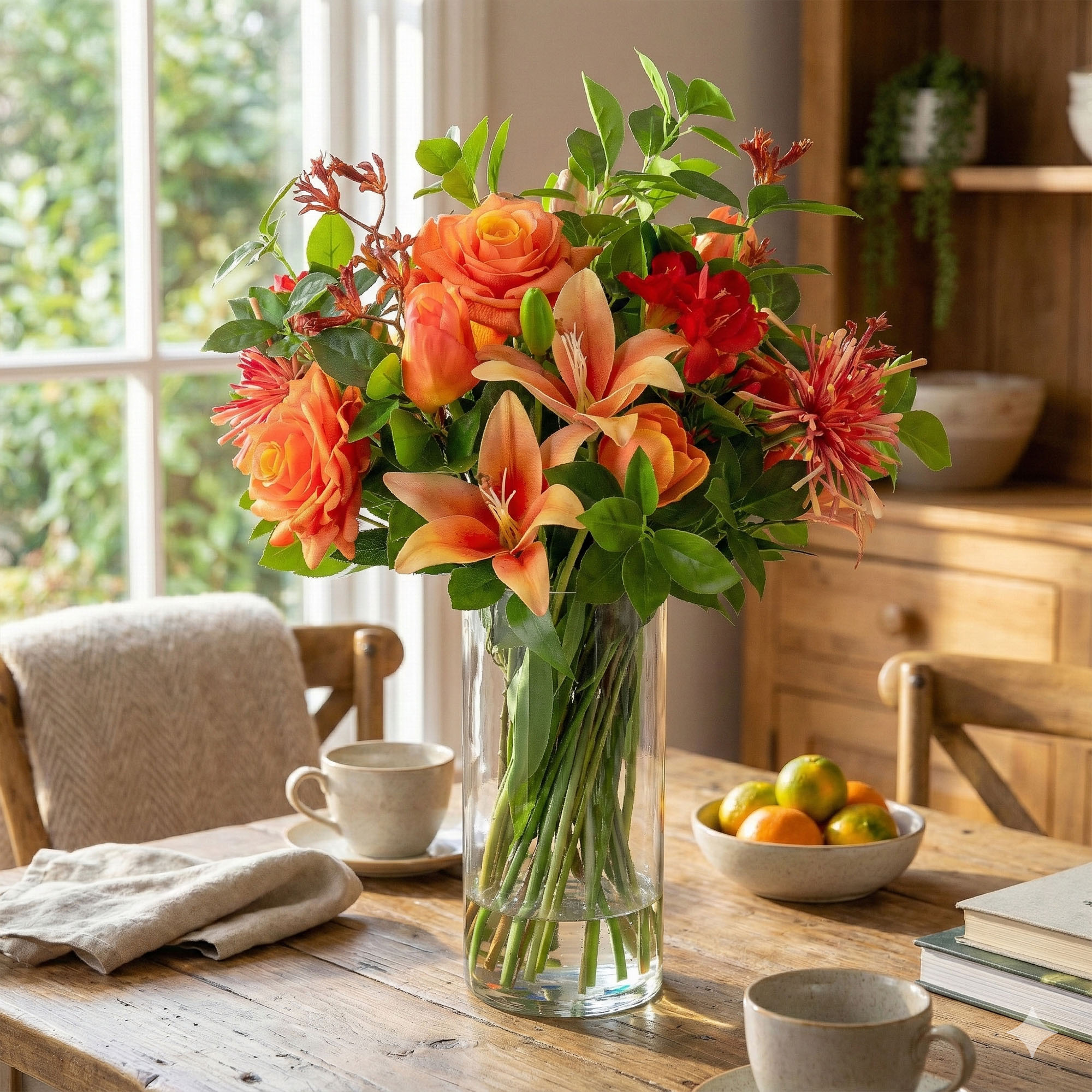 This large arrangement stands 65cm tall and 55cm wide. It is best suited for spacious areas like a large dining table, a kitchen island, or a welcoming entrance hall. The flowers are permanently set in a 30cm glass cylinder vase. The clear resin base mimics the look of fresh water perfectly for an authentic finish. You can browse our [artificial flower arrangements] category to find complementary pieces for other rooms. This floral piece acts as a stunning focal point in any indoor environment.