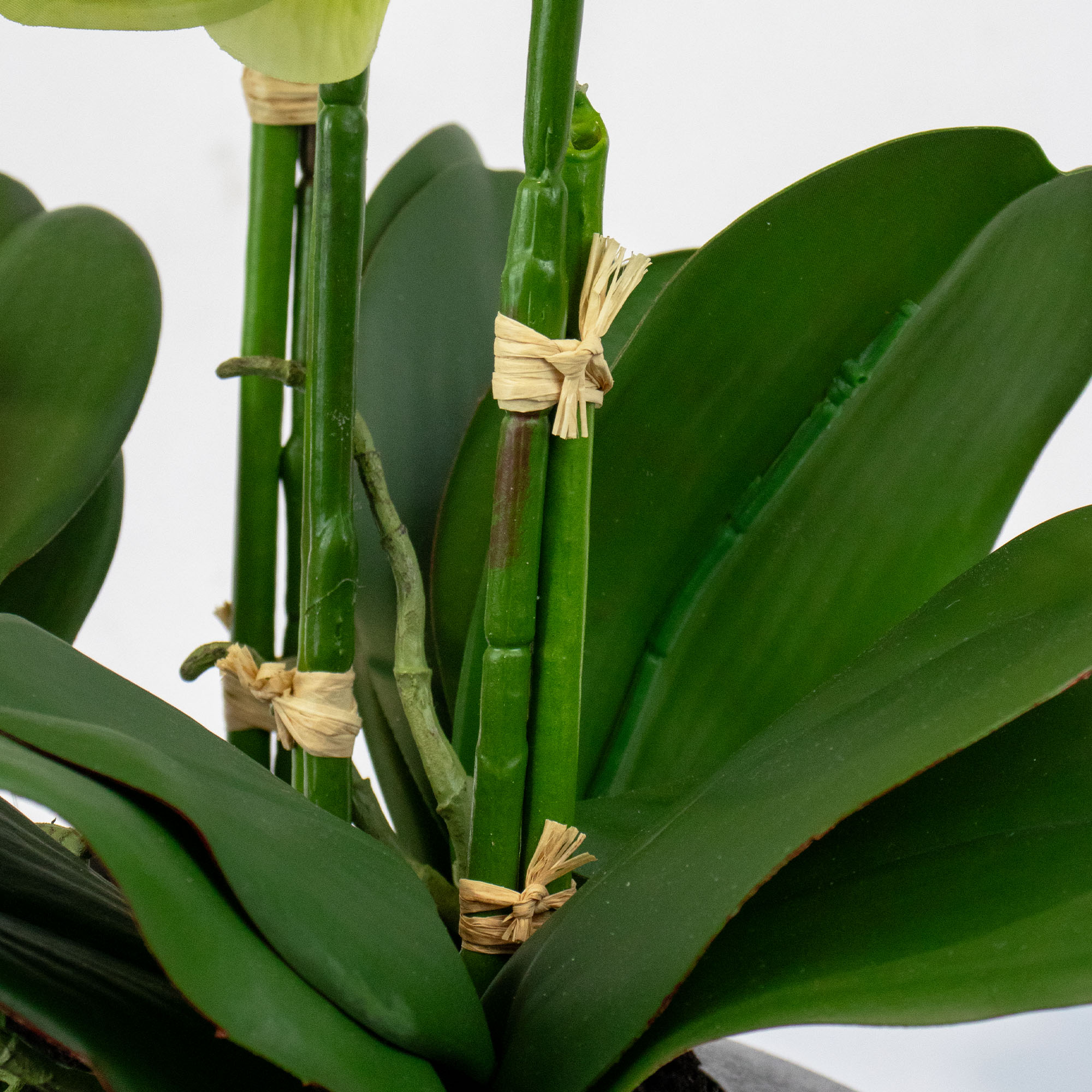 Phalaenopsis orchids are widely known as Moth Orchids. They earned this name because their wide blooms look like moths in flight. Green orchids are a unique variety that represent good health, nature, and longevity. This artificial green arrangement brings a fresh and calming energy to your living space. It features delicate green silk petals and realistic broad leaves at the base. The stalks are tied to wooden dowels to perfectly mimic the growth of live orchids.