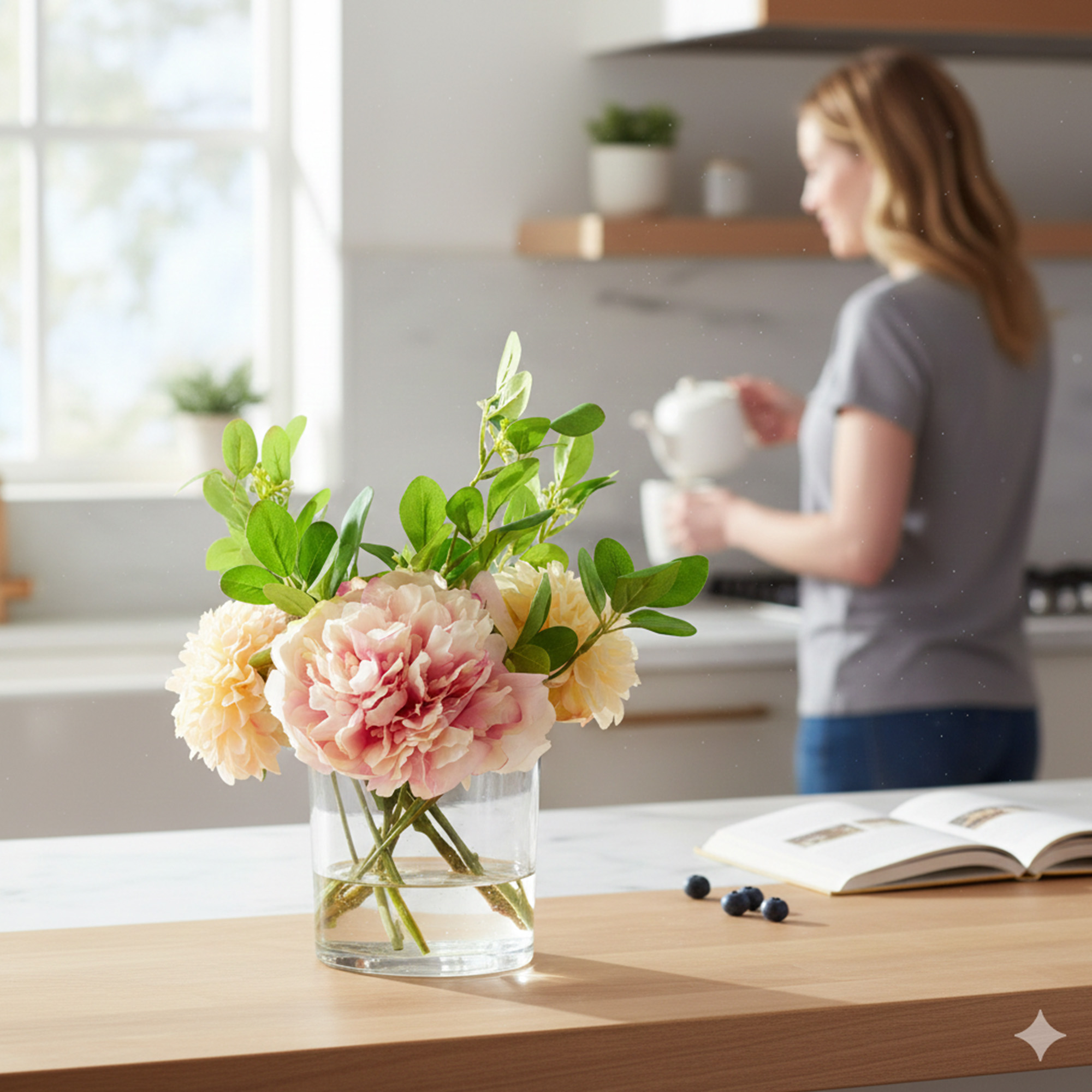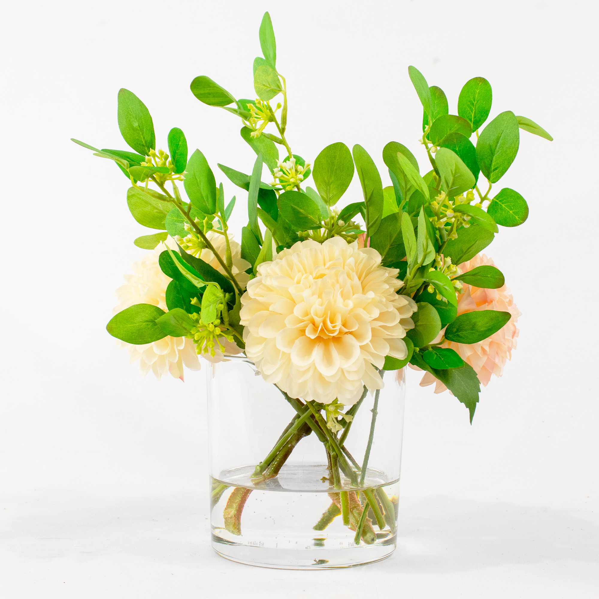 This small arrangement is 35cm tall and 25cm wide. It fits perfectly on a small side table or a kitchen counter. You can also place it on a desk to brighten up your workspace. The flowers are set in a 12cm cylinder glass vase. This vase is filled with a clear resin that looks just like water. It gives the product a very realistic and high-quality appearance.