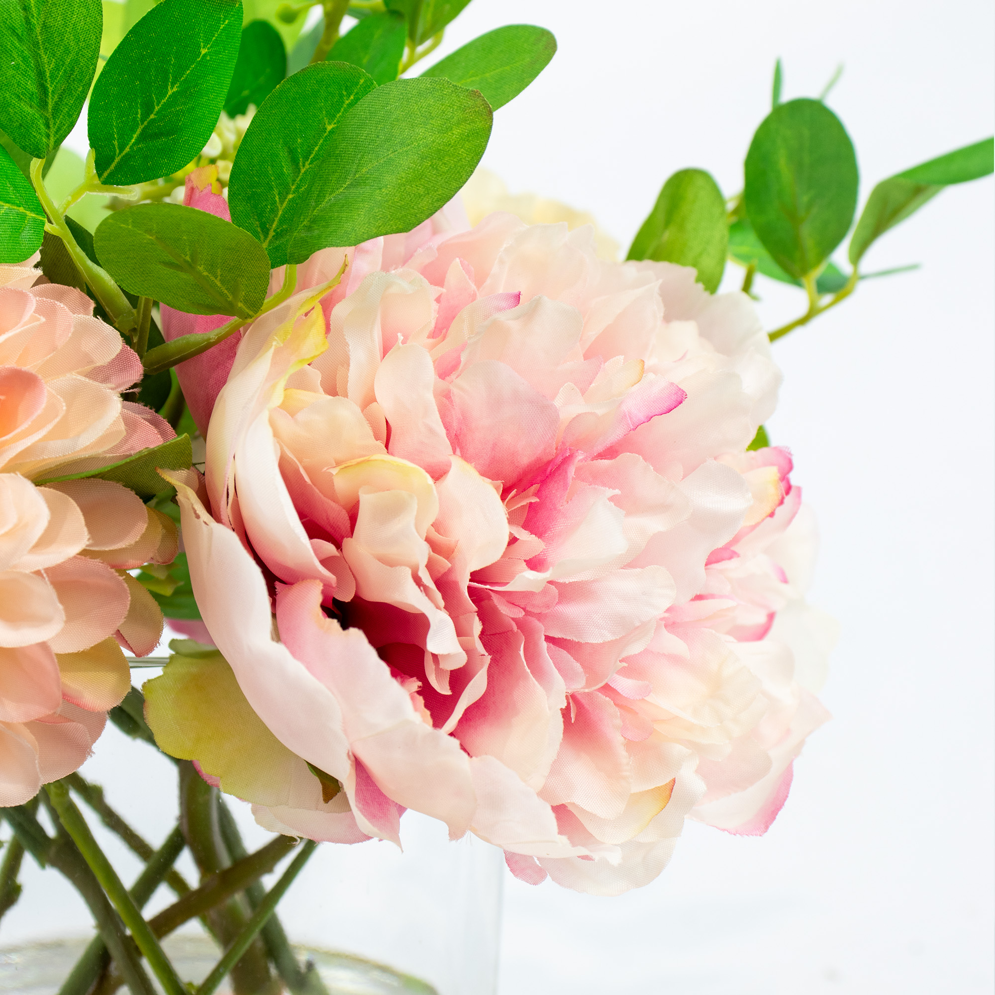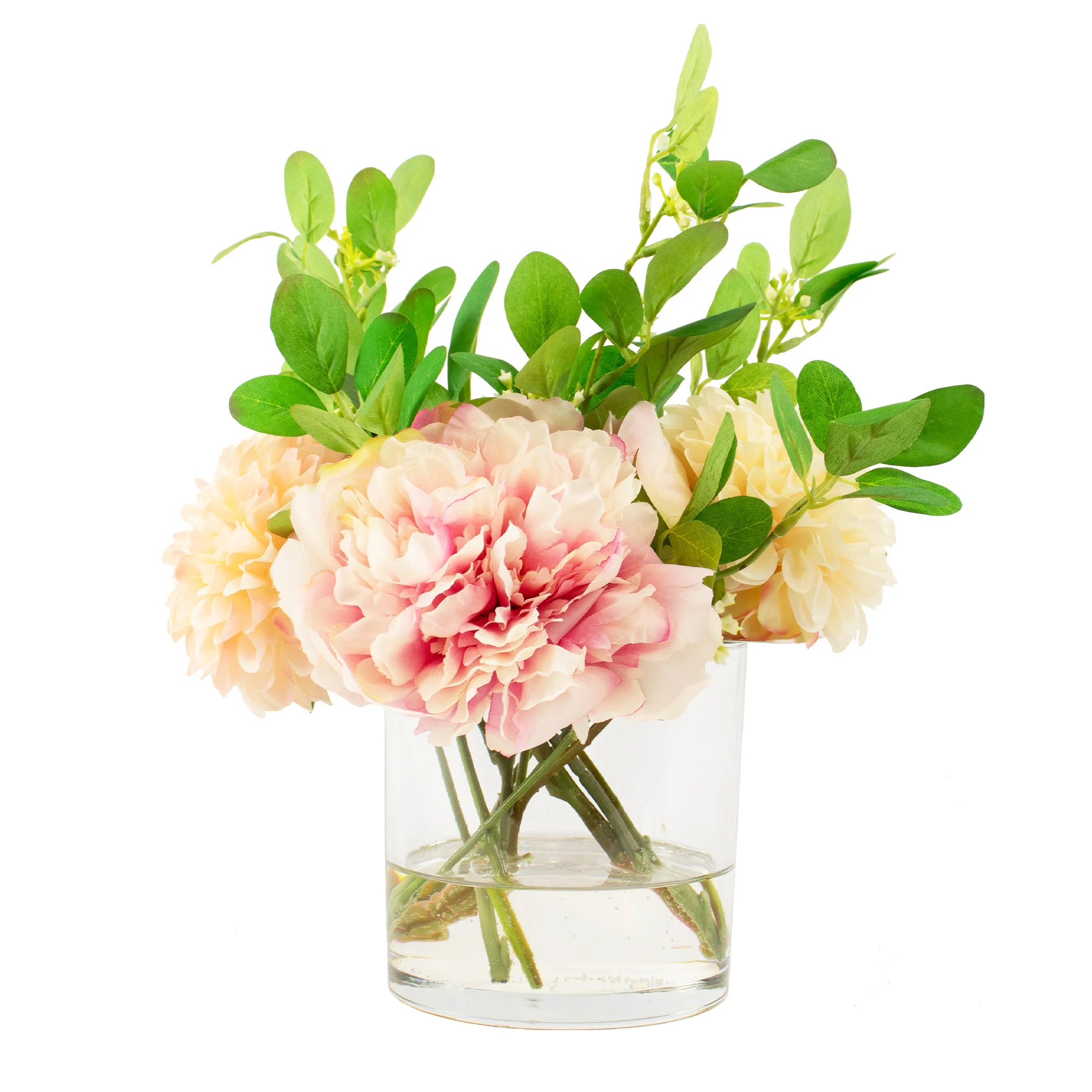 PINK PEONY AND POM-POM FLOWER ARRANGEMENT GLASS VASE