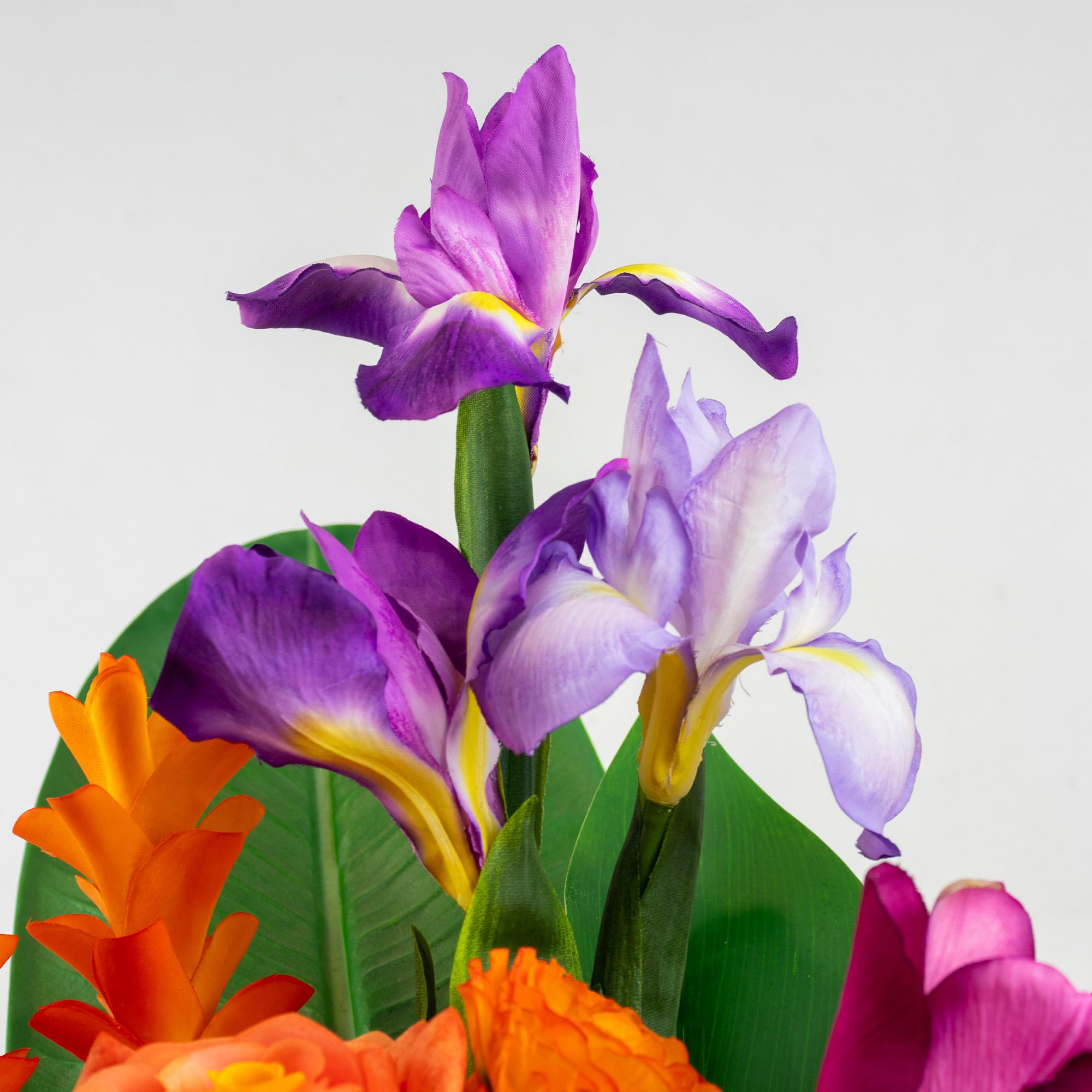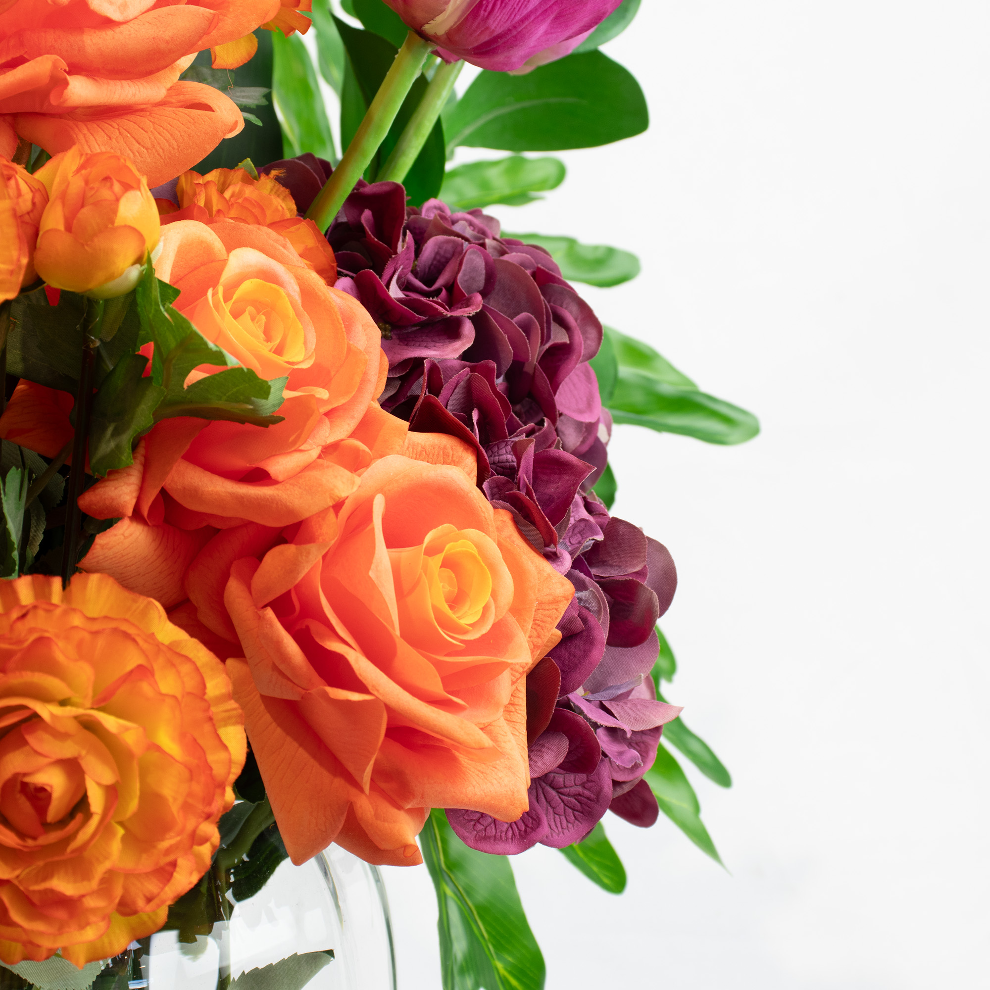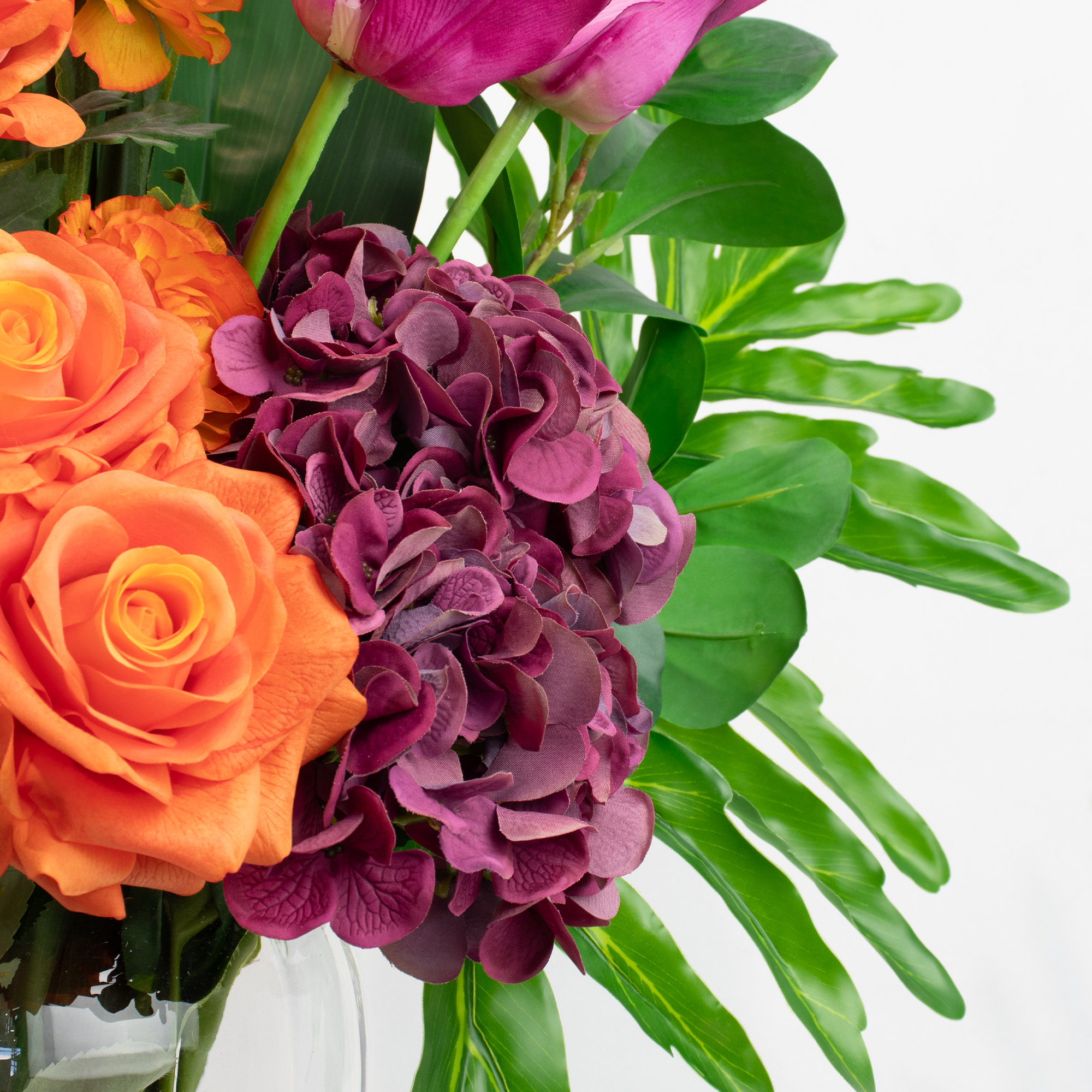The arrangement stands 90cm tall and 60cm wide. It features a bright mix of orange roses, deep purple hydrangeas, purple iris, and purple tulips. This colourful display is balanced with large green banana leaves and other foliage.