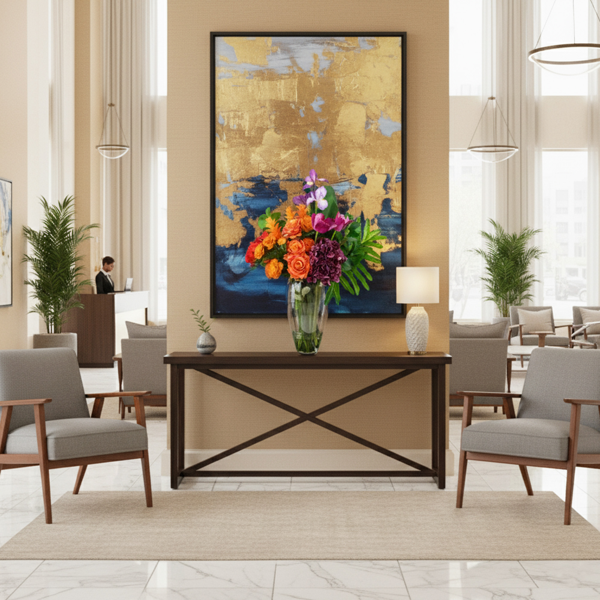 This arrangement has been styled to be front-facing. This is not a 360-degree centrepiece. This specific design makes it the perfect choice for placing against a wall. It is ideal for an entryway console, a sideboard, or a reception desk where its full, vibrant display can be seen.