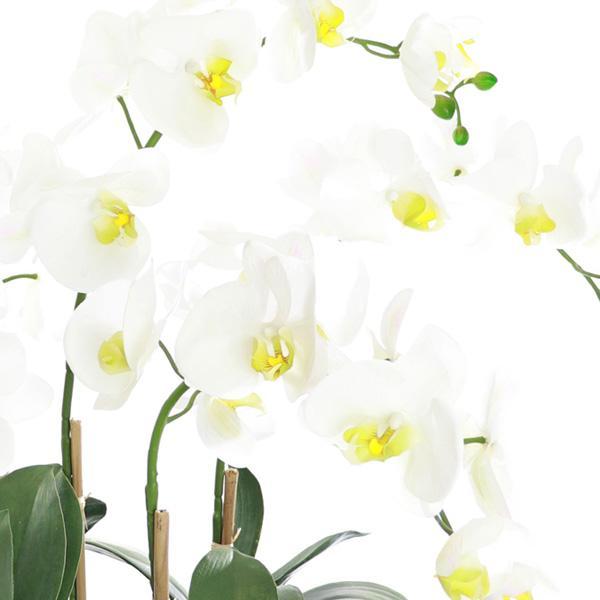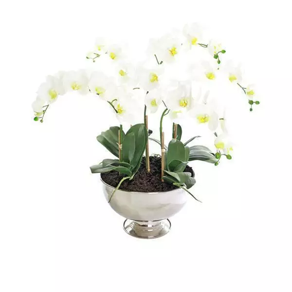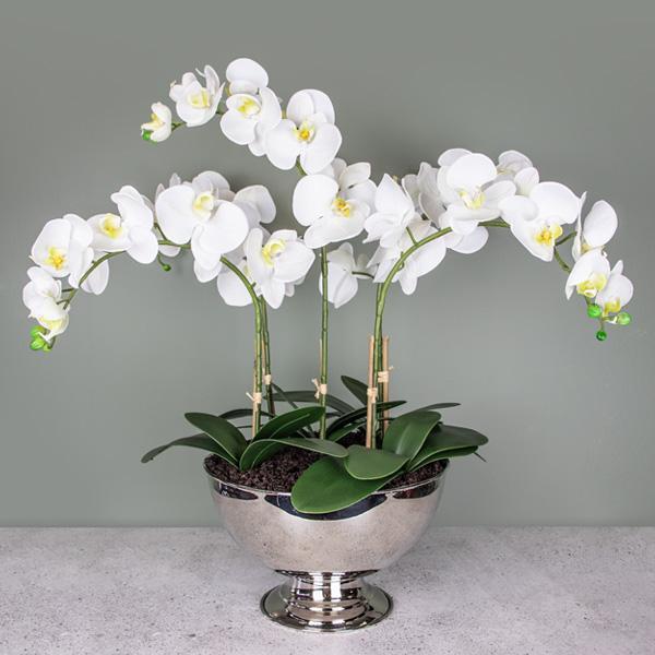 White artificial silk Phalaenopsis set in a silver rose bowl.