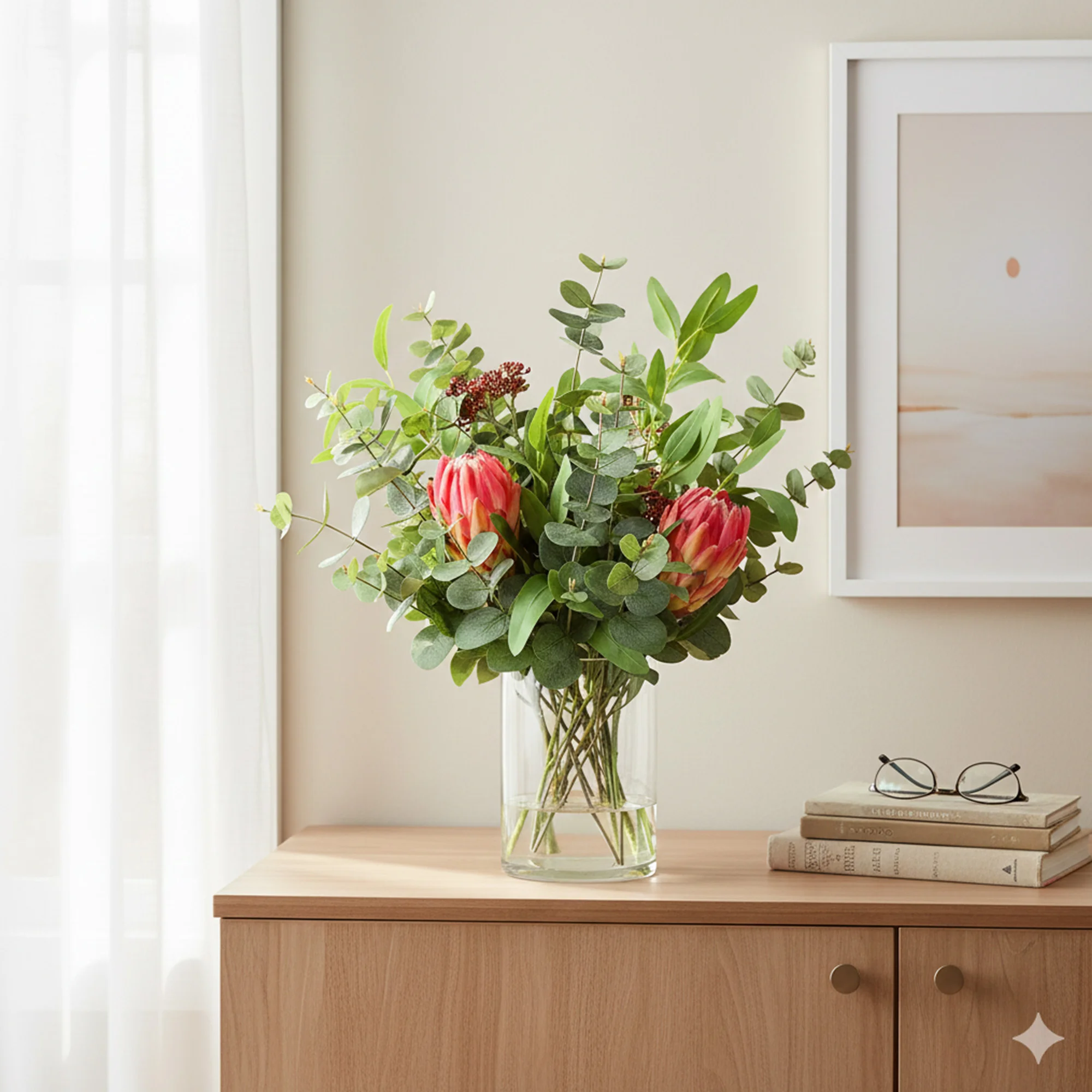 The arrangement stands 62cm tall and 45cm wide. It is set in a clear, cylindrical glass vase that allows the natural-looking stems to be fully seen. We use authentic materials to ensure the textured protea heads, detailed berries, and soft eucalyptus leaves look realistic. A hard, clear resin at the bottom holds the stems securely in place and mimics the look of fresh water.