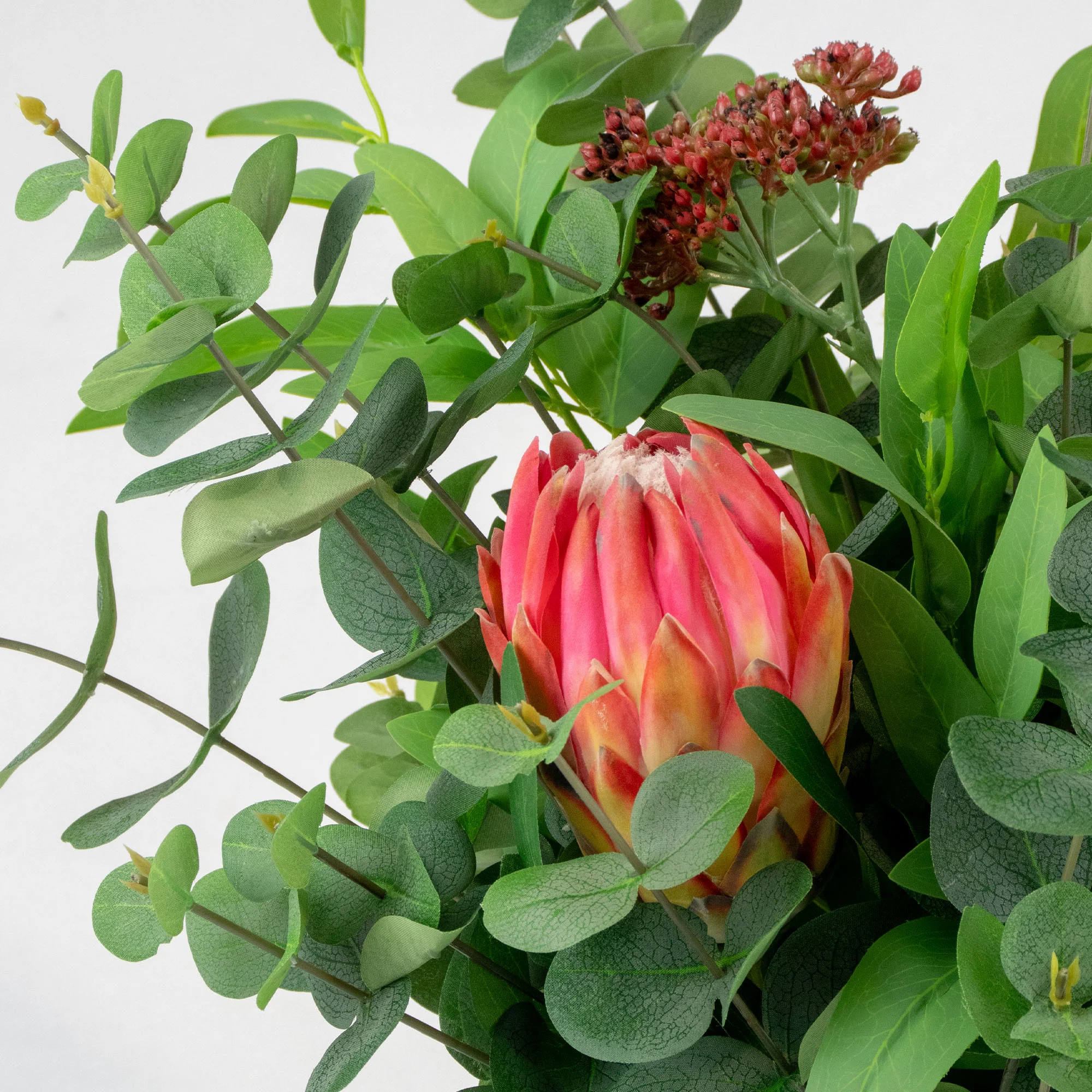 This large and striking arrangement features bold red proteas, celebrating the unique beauty of South African flora. Its main benefit is its dramatic, lasting impact. The vibrant red flowers and fresh green eucalyptus leaves create a modern, sophisticated look that stays perfect year-round with no water or maintenance.