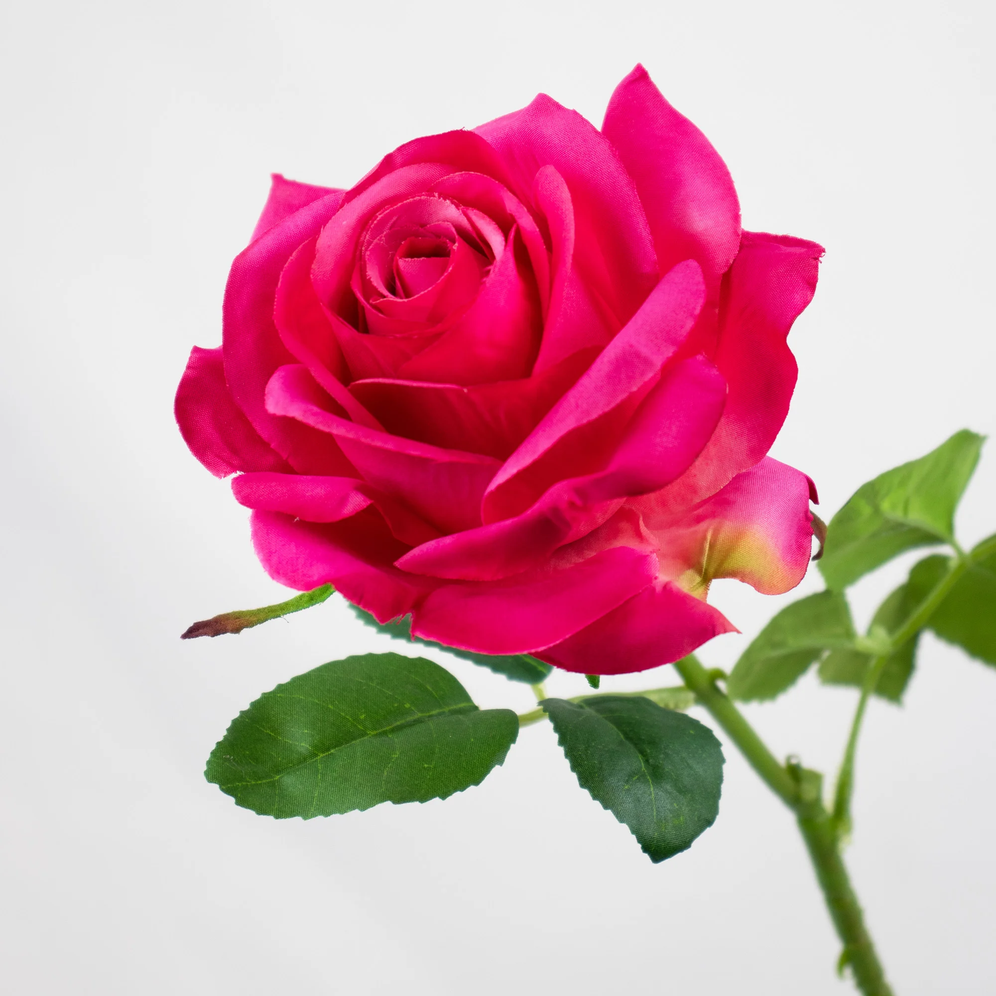 Pink Rose Stem – American Beauty, Open Bloom with Leaves, 62cm Artificial Flower