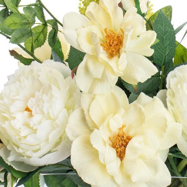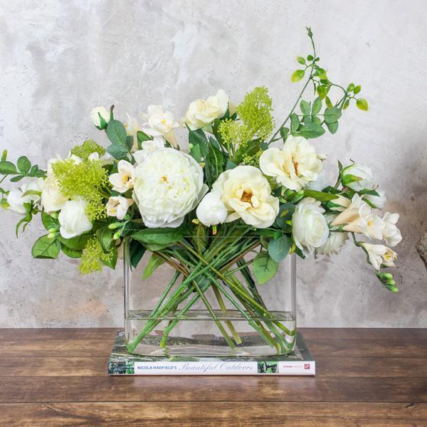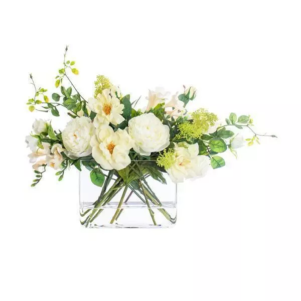 Mixed artificial White Roses and Peony set in a rectangular glass vase.