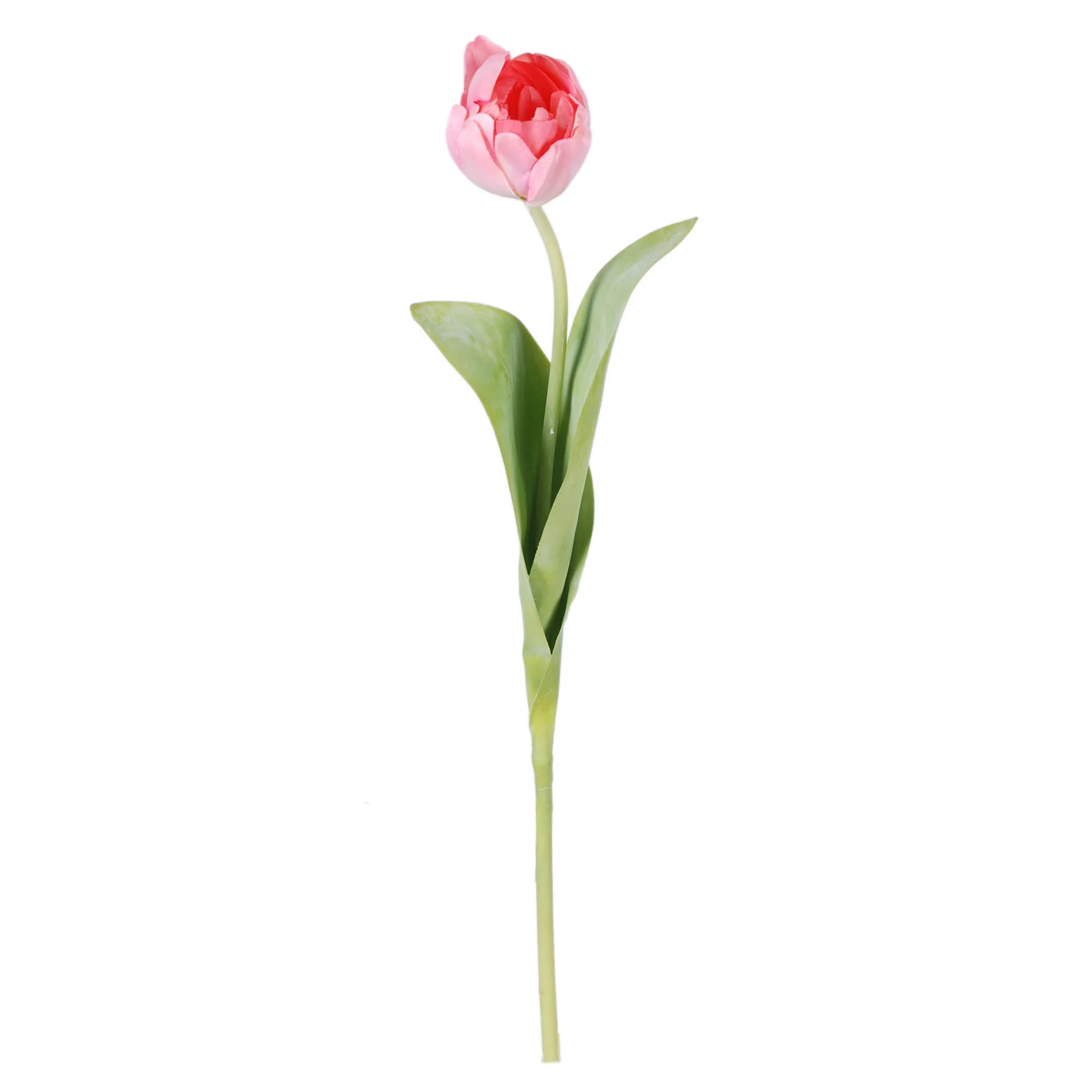 The stem measures a versatile 45cm in length, making it an excellent choice for medium-sized vases and jugs. It features a smooth, sturdy green stalk that supports a single, beautifully detailed tulip flower head in an eye-catching fuchsia pink hue. The stem is perfectly complemented by characteristic broad, lance-shaped green leaves that wrap gracefully around the base, adding an essential touch of botanical realism to the display.