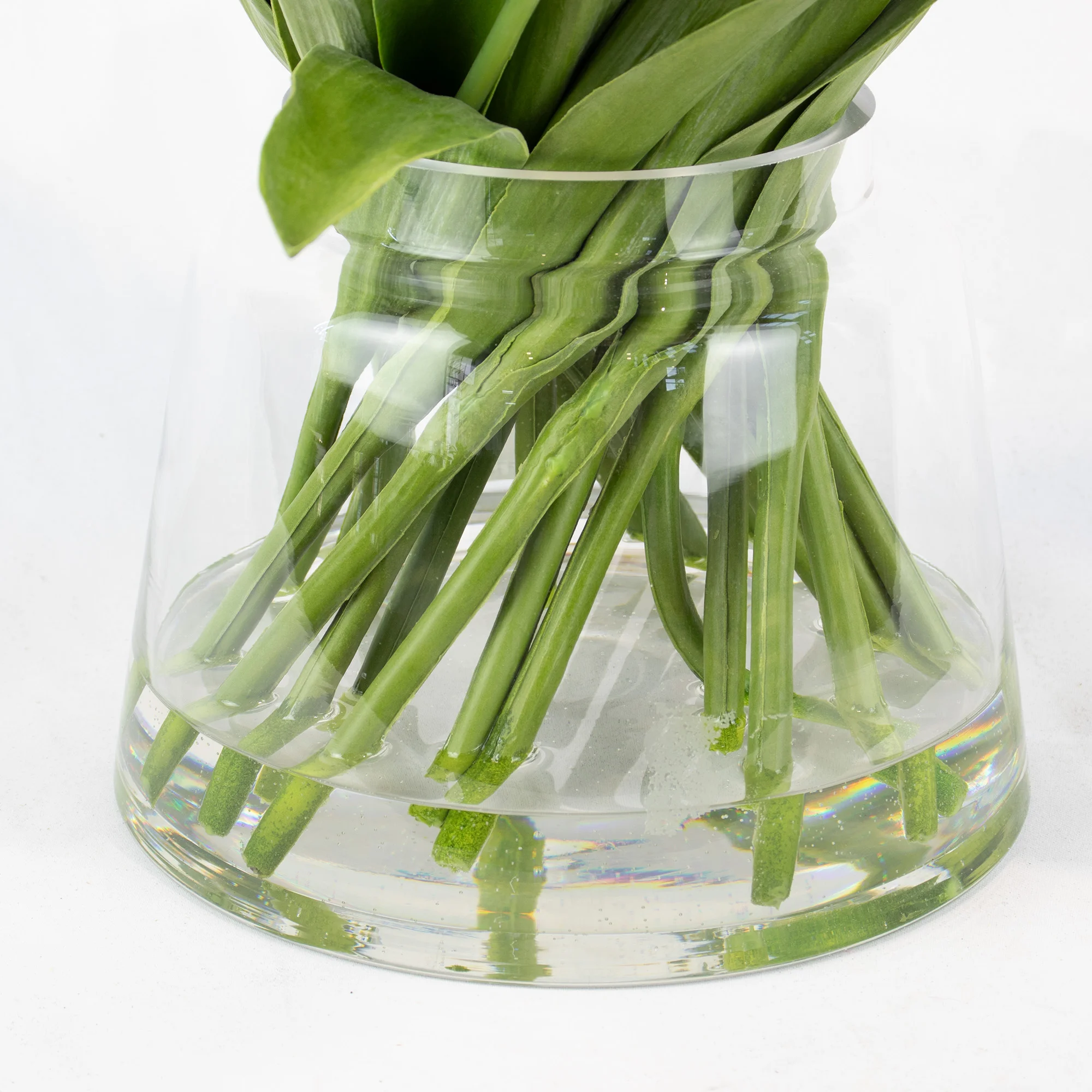 The stems are set in a hard, water-like resin at the bottom of the glass vase. This clear resin holds the arrangement perfectly in place and gives the illusion of fresh water. The entire piece stands 38cm tall and 37cm wide. The stems of this arrangement are flexible. This allows you to gently adjust the flowers and leaves. You can shape the display to get the exact look you want for your space.