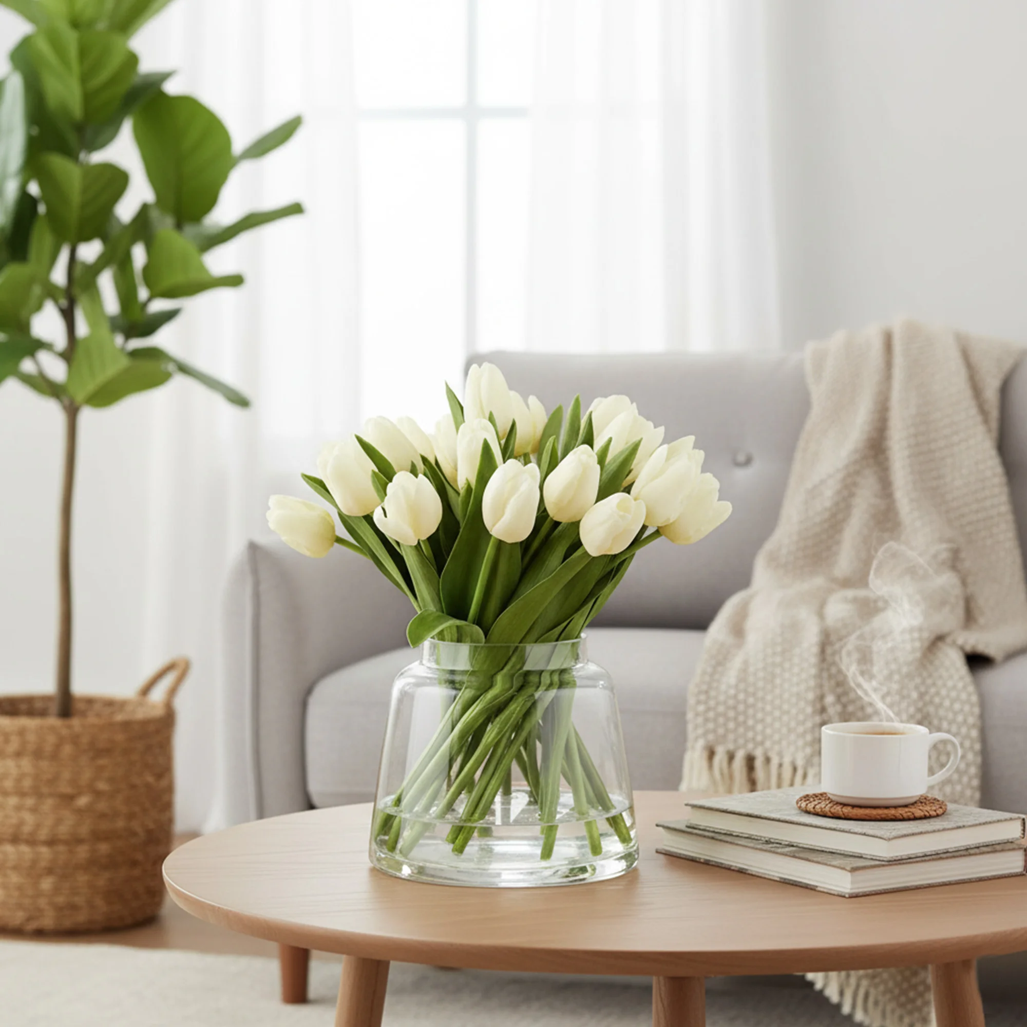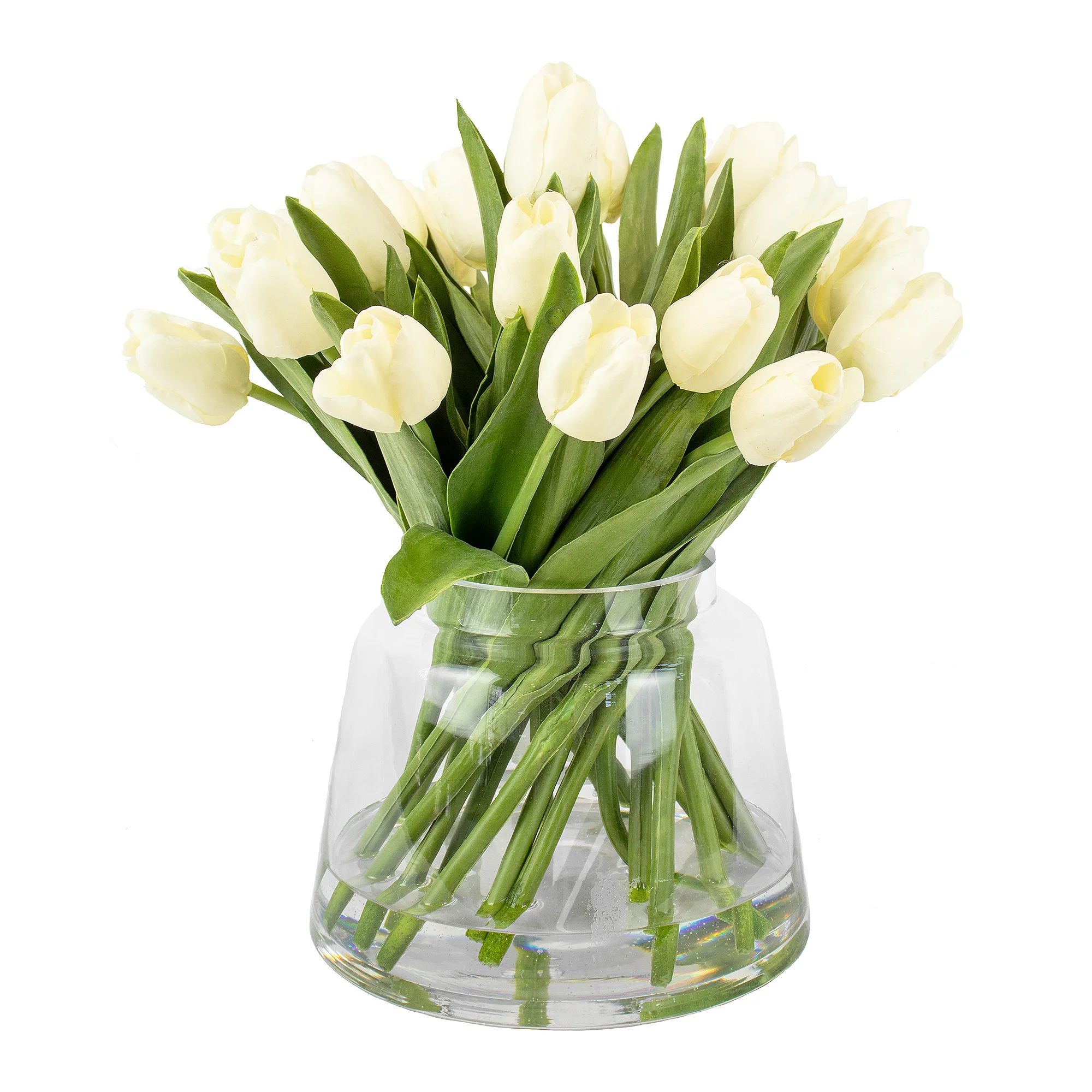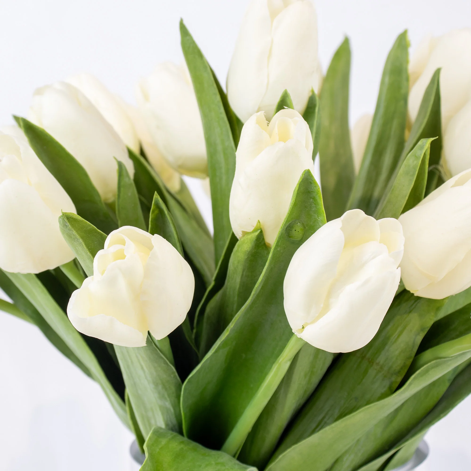 This arrangement celebrates the simple beauty of classic white tulips. The flowers are gathered in a generous, full bunch and placed in a clear glass jar. It is a timeless piece designed to bring a feel of fresh spring into your home, all year long. An interesting fact about tulips is that white ones often stand for purity, a new beginning, or forgiveness. They bring a sense of peace and calm to a room.