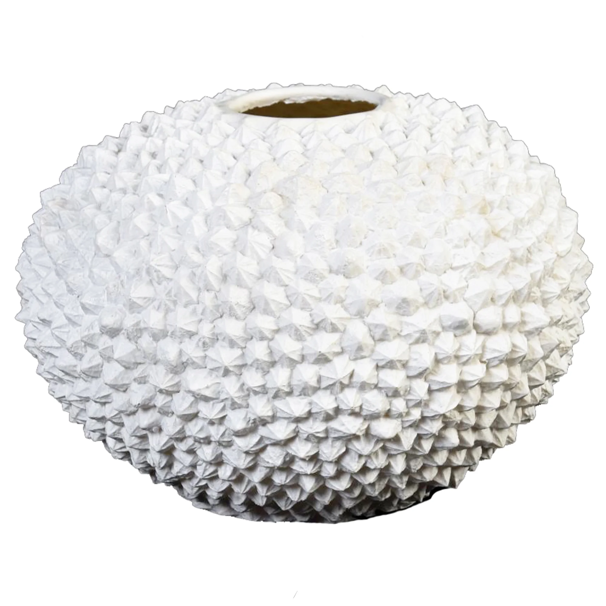 The vase measures 34cm in width and 23cm in height, creating a substantial, rounded "pod" silhouette. It is crafted from crisp white polyresin and is covered entirely in raised, pyramidal studs, giving it a signature "sea urchin" texture that plays beautifully with light and shadow. The vessel features a small 3cm opening at the top, designed to hold a single delicate stem or simply to complete the form of the object.