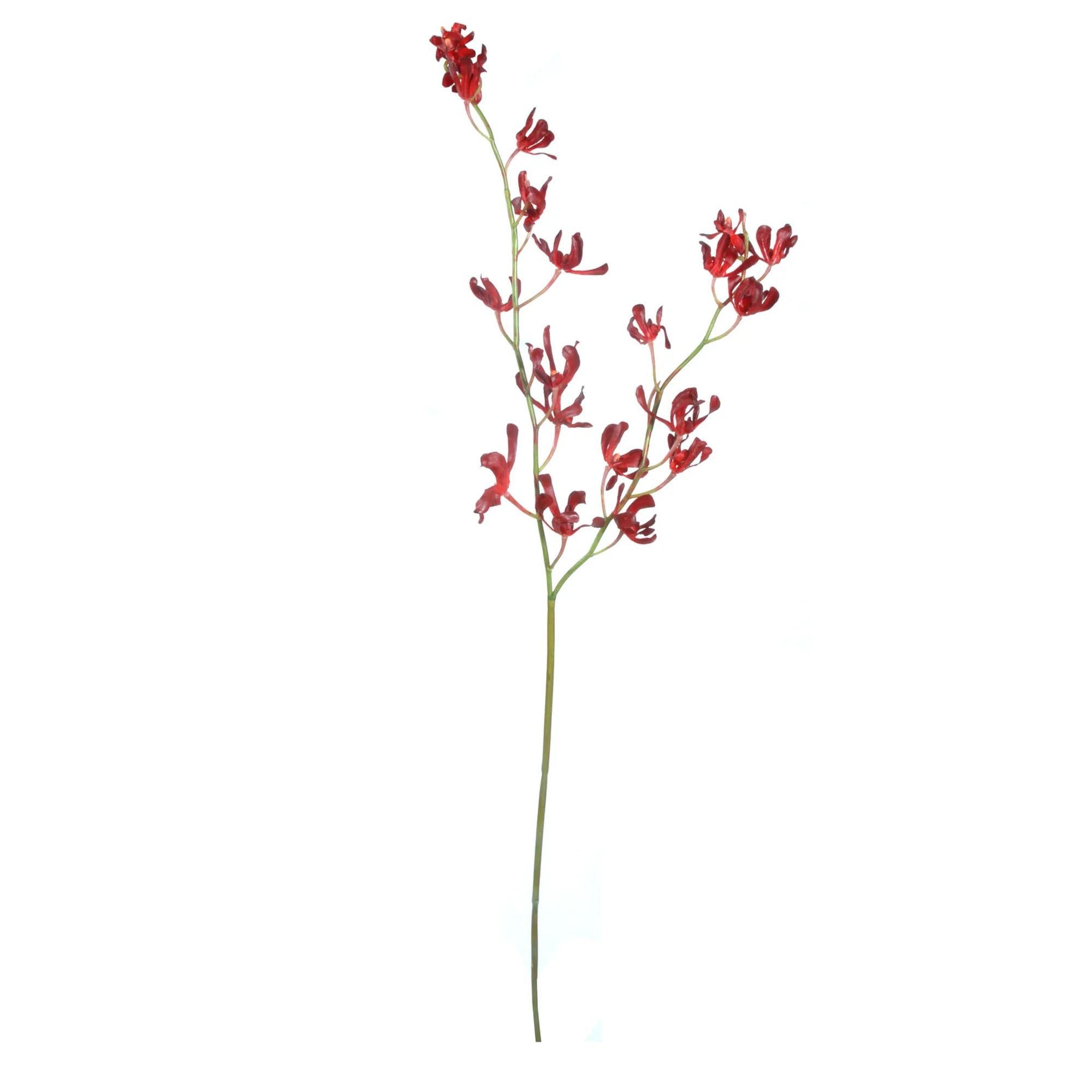 This dramatic artificial Vanda Orchid branch features a spray of deep red blooms. Its main benefit is adding a unique, exotic texture and significant height to your floral arrangements. It offers the intricate, wild beauty of the Vanda orchid in a durable form that creates a striking silhouette without the need for humidity or special care.