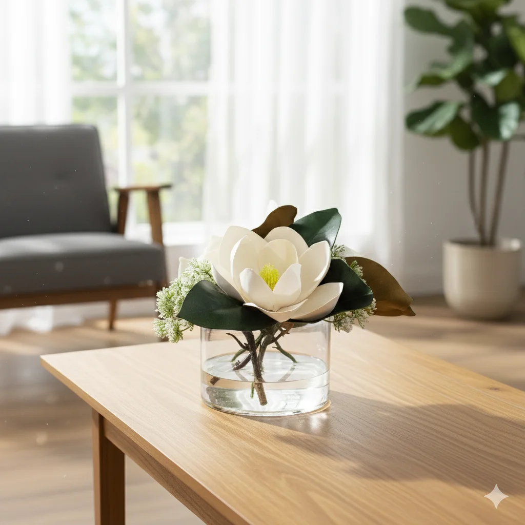 This smaller, approachable size is perfect for a desktop, a bedside table, a bathroom counter, or a bookshelf. Magnolias are ancient flowers and often symbolizes dignity and purity, bringing a calm, friendly feel to your space.