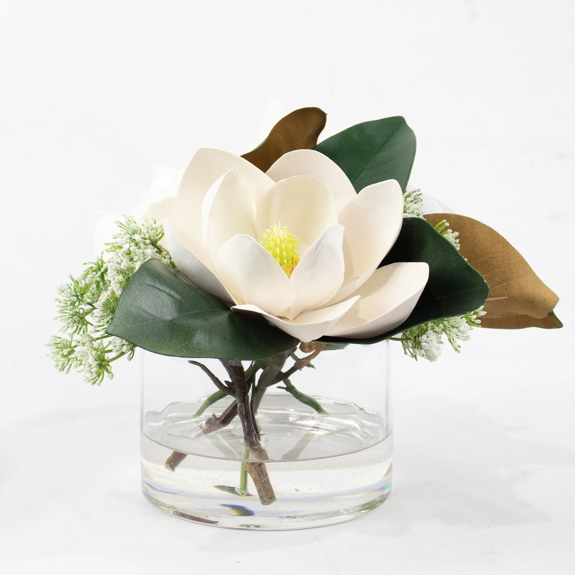 WHITE MAGNOLIA WITH QUEEN ANNE LACE IN CYLINDER VASE
