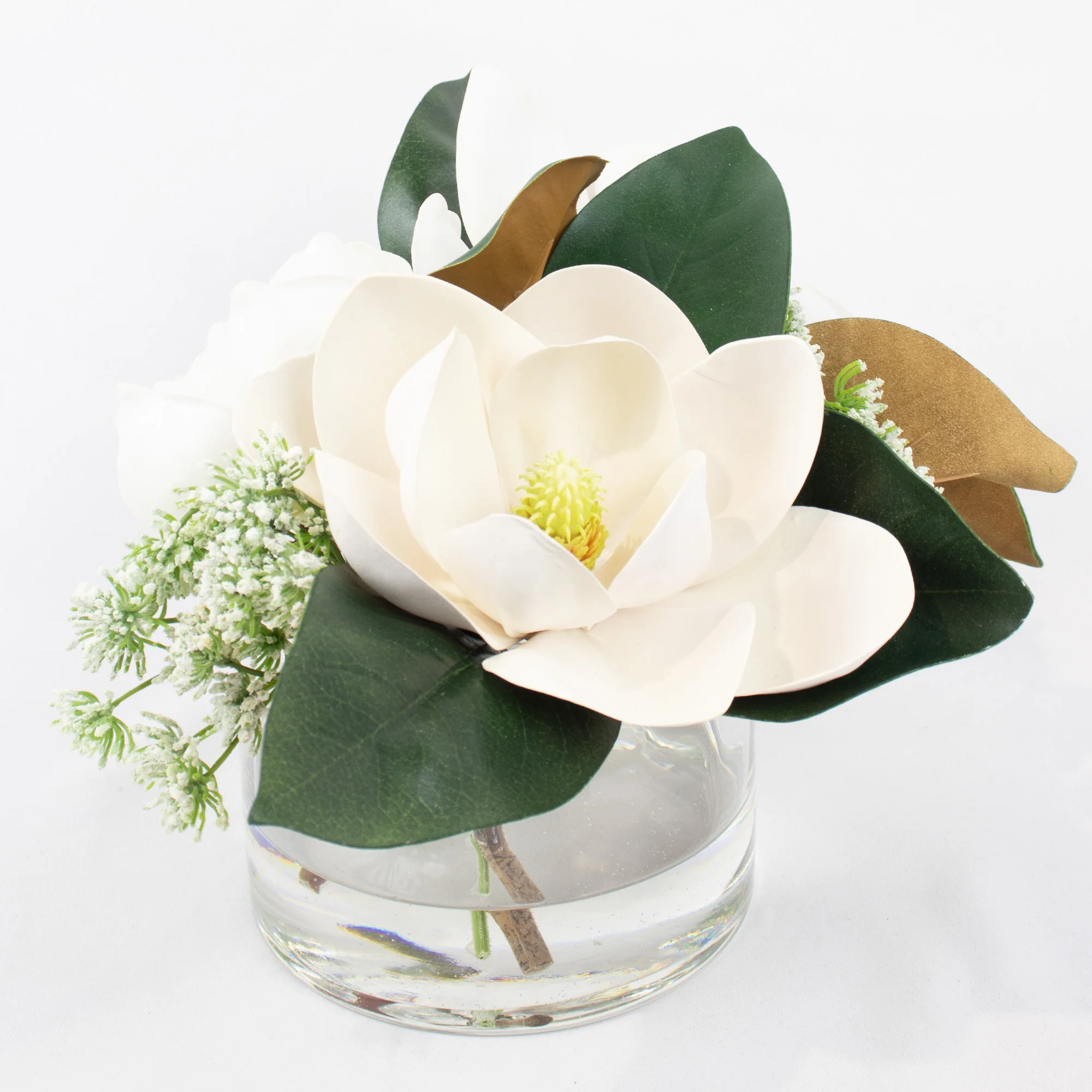This is a classic artificial white magnolia arrangement. The arrangement features a large, realistic white magnolia flower as the centrepiece. This is complemented by white Queen Anne's Lace and the iconic, two-toned magnolia leaves. Its main benefit is its timeless, sophisticated style, captured in a compact size. It stands 24cm tall and measures 30cm at its widest point.