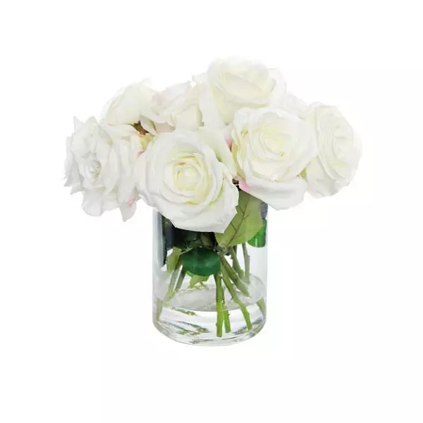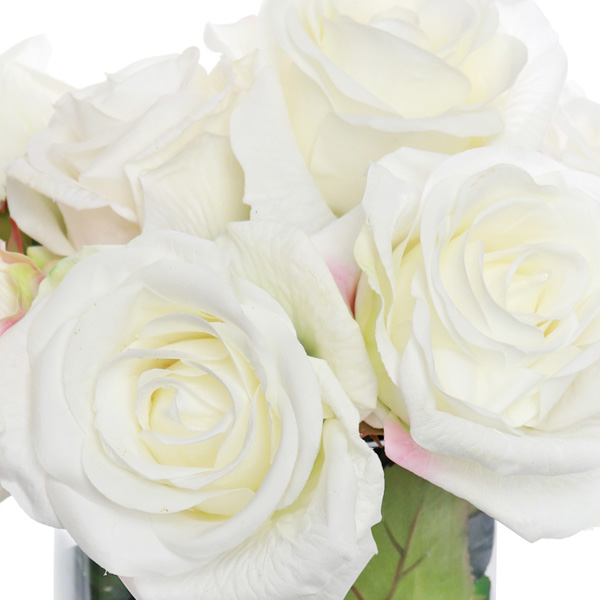 White artificial silk Rose stems set in a clear glass cylindrical vase.